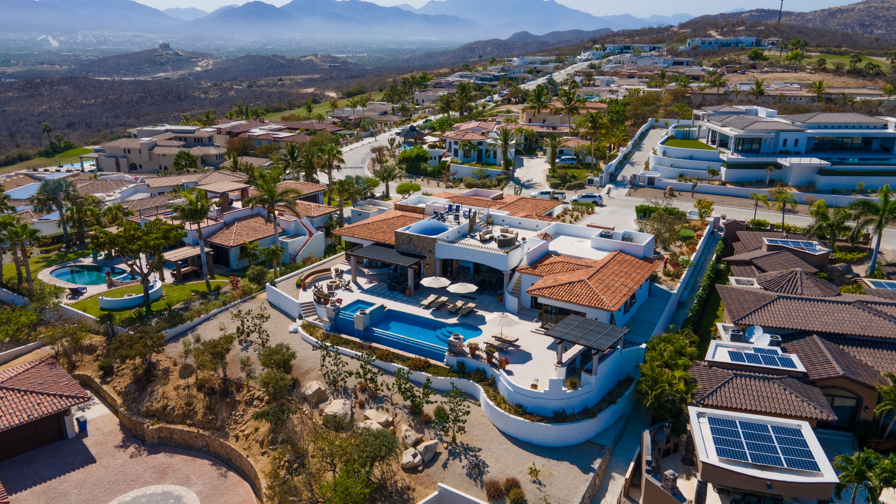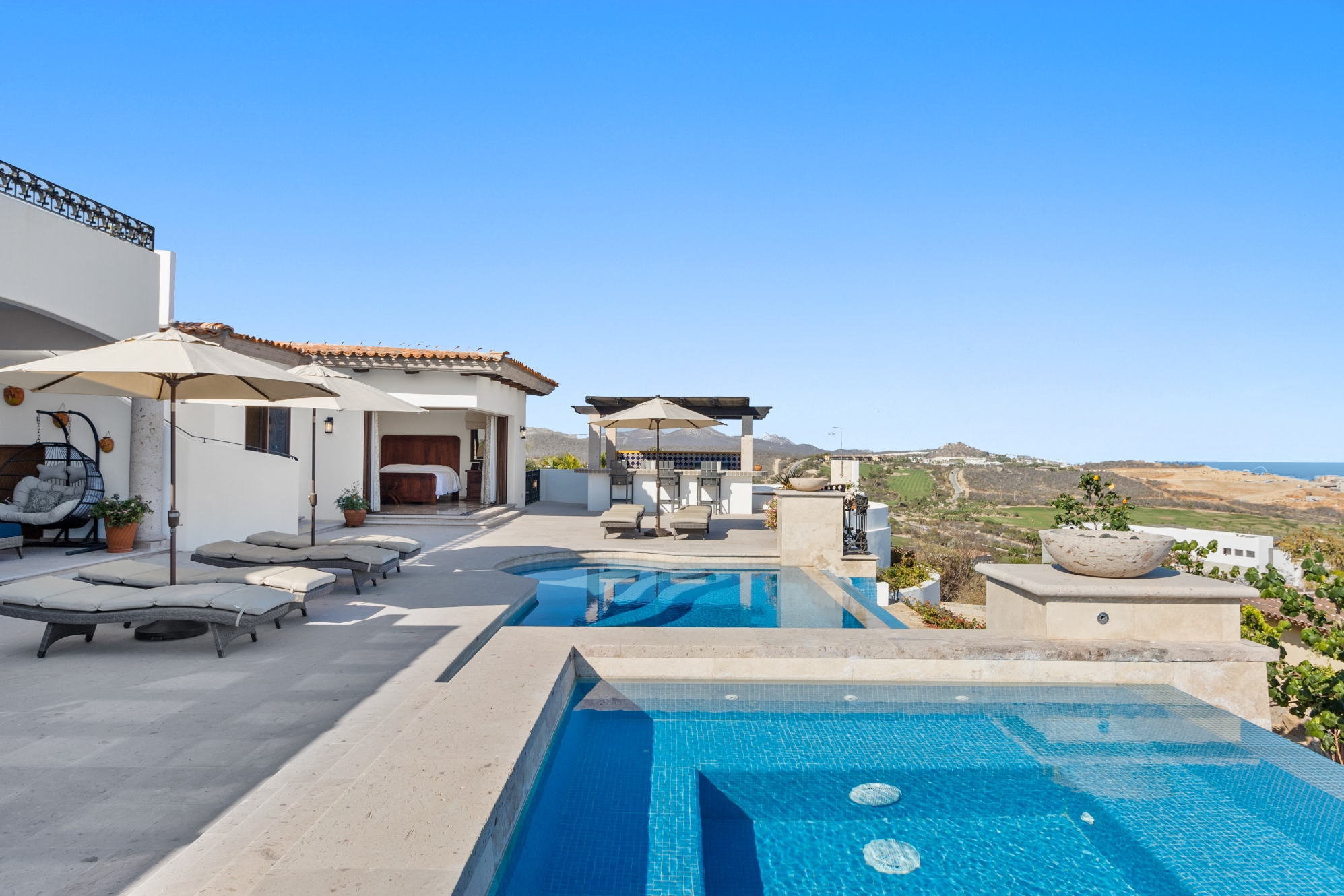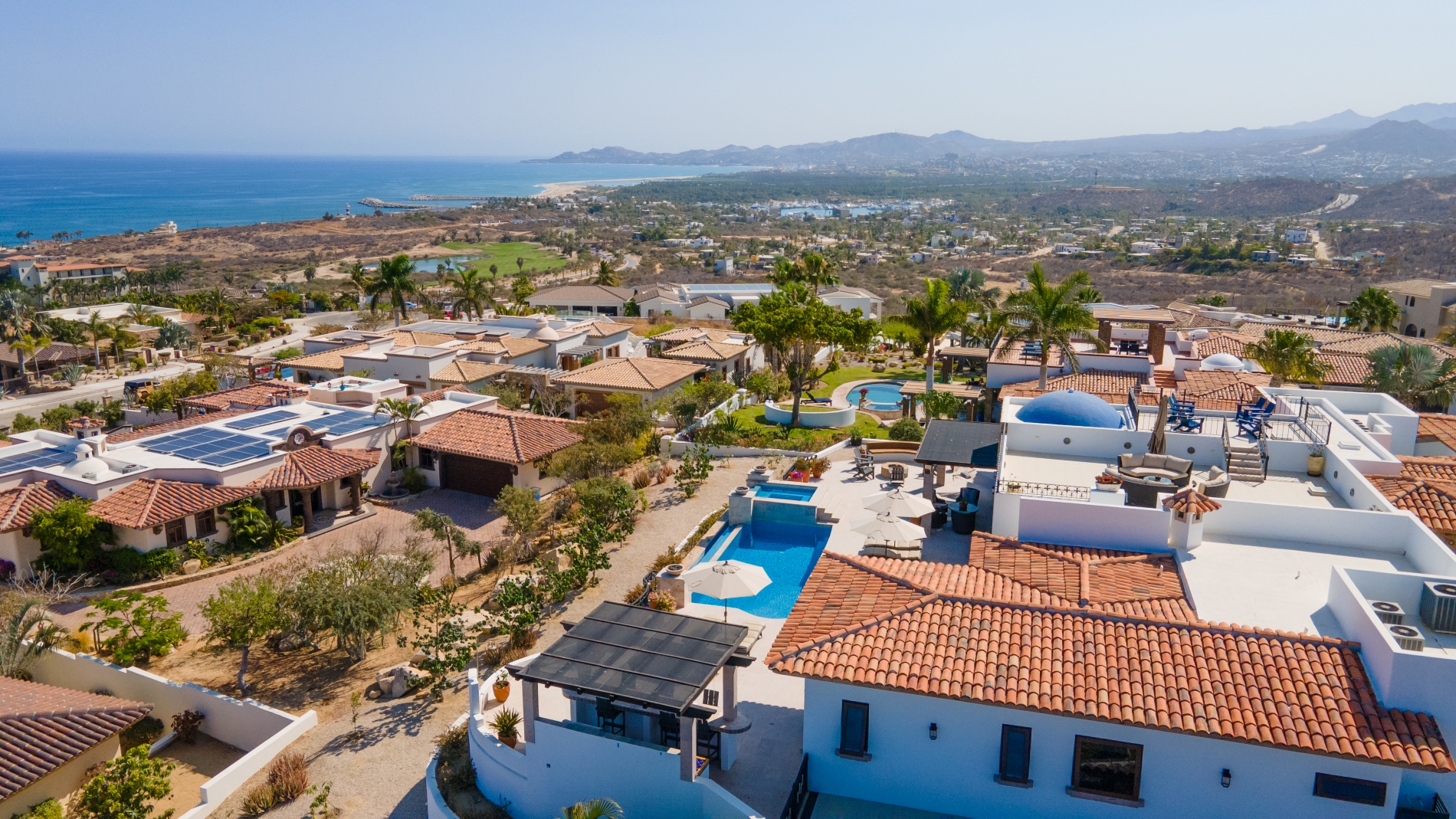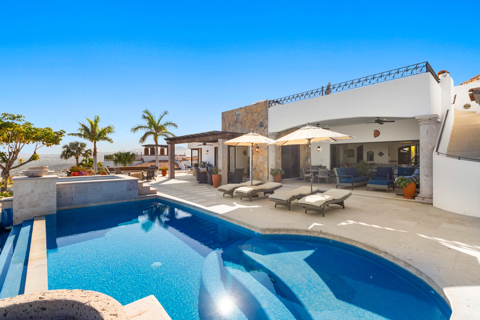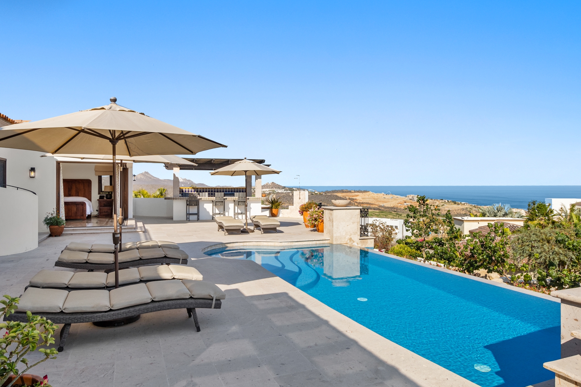 Nestled atop the Altillo Community, this remarkable single-level, seven-bedroom home boasts unbeatable 180-degree views, including Palmilla Point, the lighthouse, the marina, the golf course, mountains, and city lights. The expansive open floor plan includes five spacious bedrooms, each with an en-suite bathroom, perfect for relaxation. Additional features include a TV room, gym, and a charming casita complete with its own private kitchen, living room, and bedroom. The home is designed with two walk-in master closets, eight skylights, an outdoor shower, and a Sonos music system both inside and outside. The hurricane-resistant windows flood the home with natural light, offering breathtaking ocean vistas from every room. The outdoor pool and BBQ area seamlessly blend indoor and outdoor living, creating an ideal space for entertaining. The two-level rooftop sitting area provides a perfect spot to enjoy sunrises, sunsets, and moonrises. At the end of the day, you can relax on the roof deck, enjoying a glass of wine while taking in the unobstructed 360-degree views - a rare feature in PLC. This home truly offers a unique and luxurious living experience.
