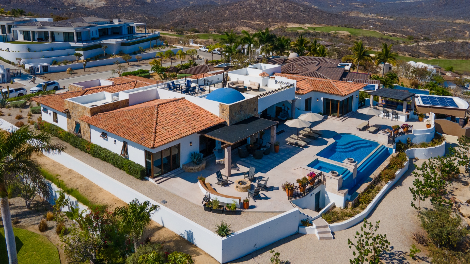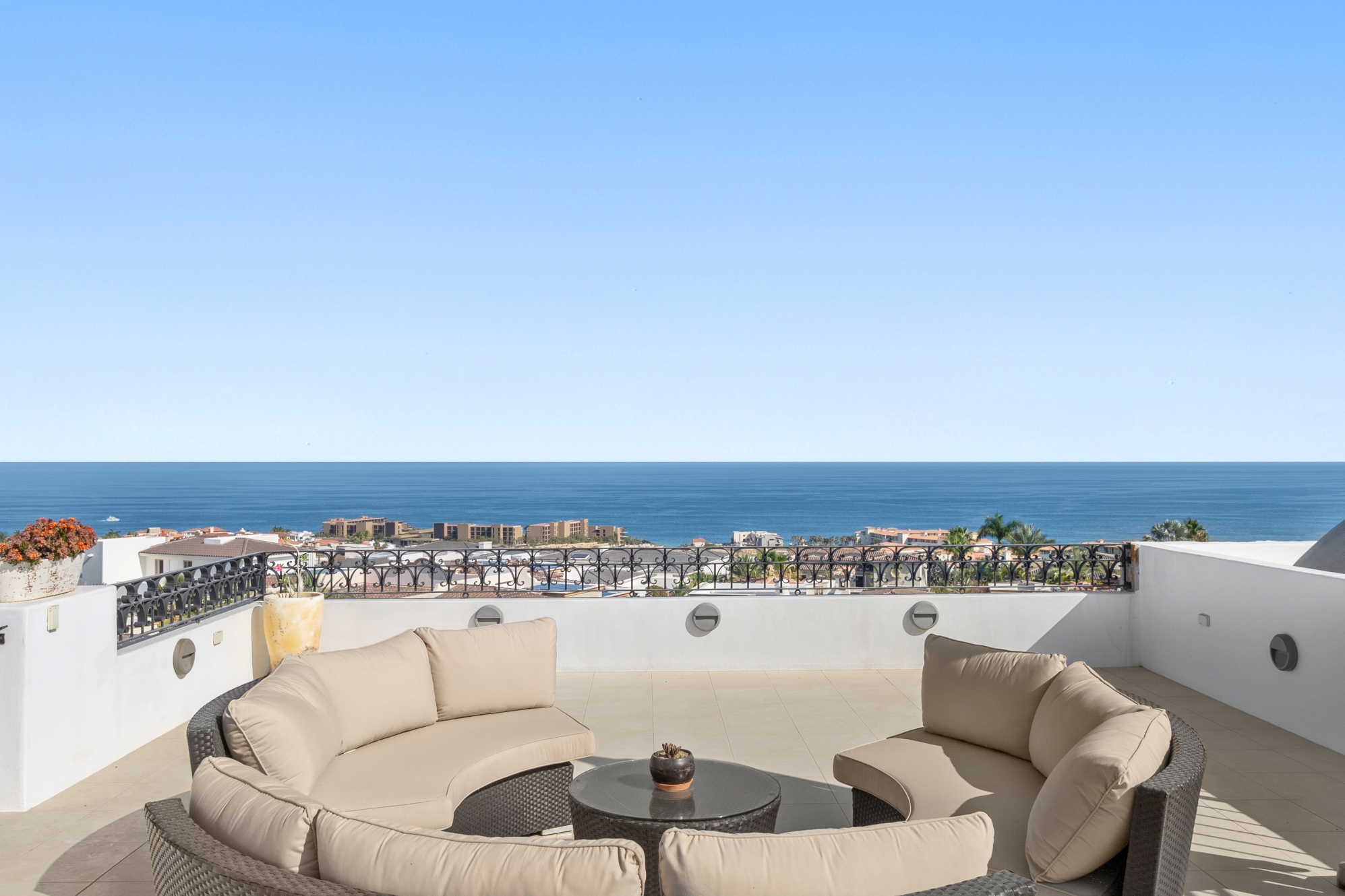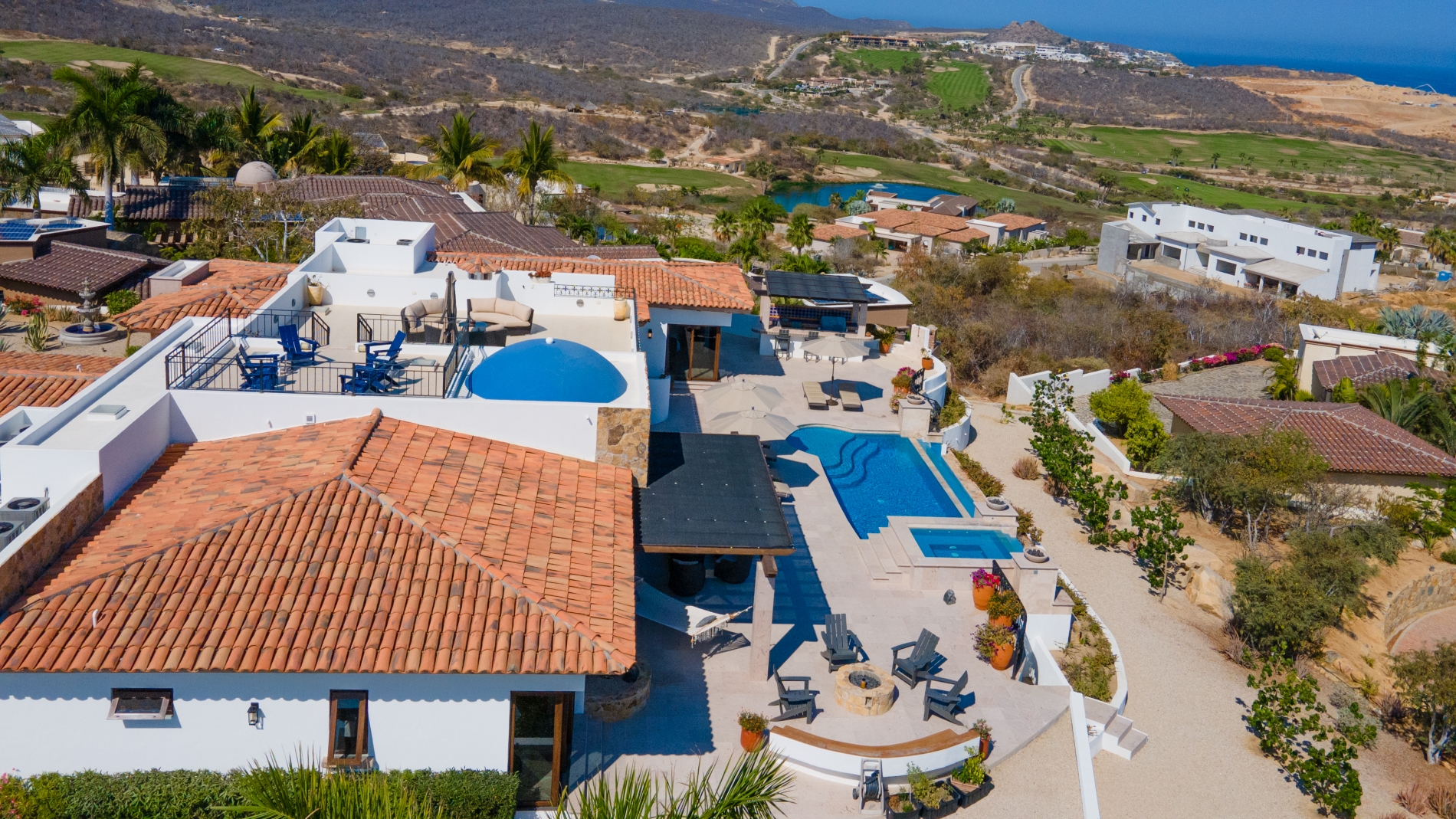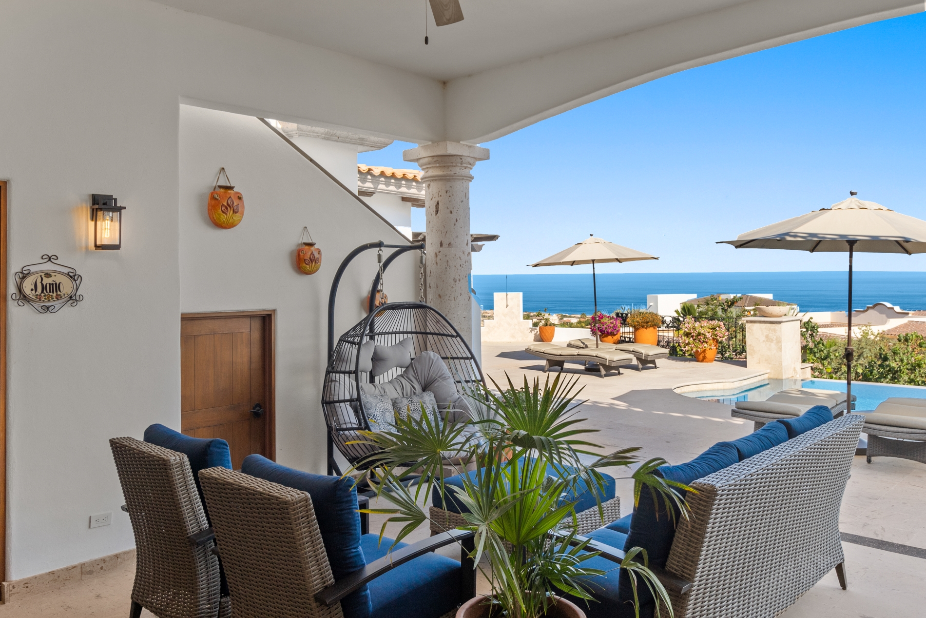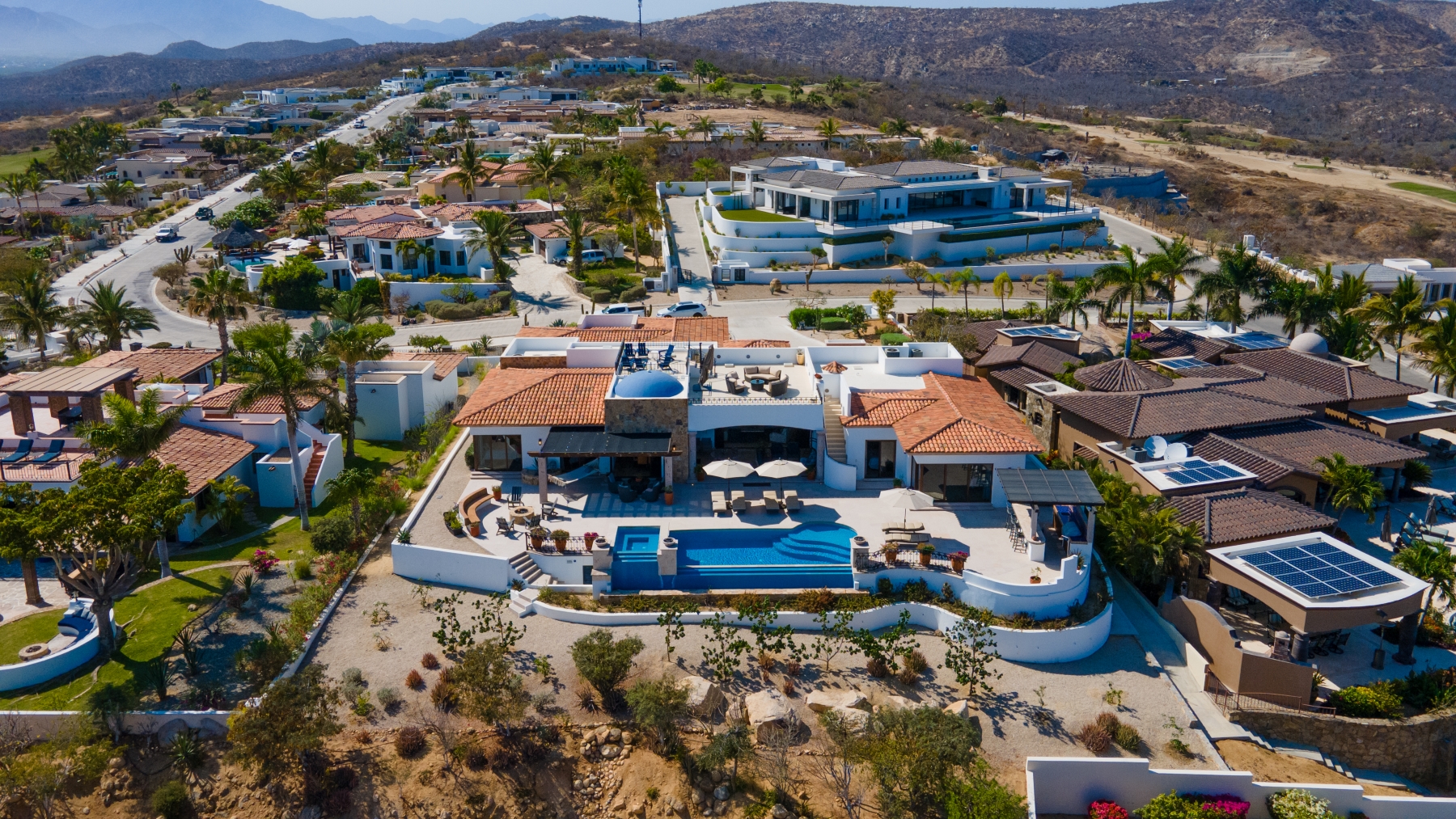 Nestled atop the Altillo Community, this remarkable single-level, seven-bedroom home boasts unbeatable 180-degree views, including Palmilla Point, the lighthouse, the marina, the golf course, mountains, and city lights. The expansive open floor plan includes five spacious bedrooms, each with an en-suite bathroom, perfect for relaxation. Additional features include a TV room, gym, and a charming casita complete with its own private kitchen, living room, and bedroom. The home is designed with two walk-in master closets, eight skylights, an outdoor shower, and a Sonos music system both inside and outside. The hurricane-resistant windows flood the home with natural light, offering breathtaking ocean vistas from every room. The outdoor pool and BBQ area seamlessly blend indoor and outdoor living, creating an ideal space for entertaining. The two-level rooftop sitting area provides a perfect spot to enjoy sunrises, sunsets, and moonrises. At the end of the day, you can relax on the roof deck, enjoying a glass of wine while taking in the unobstructed 360-degree views - a rare feature in PLC. This home truly offers a unique and luxurious living experience.