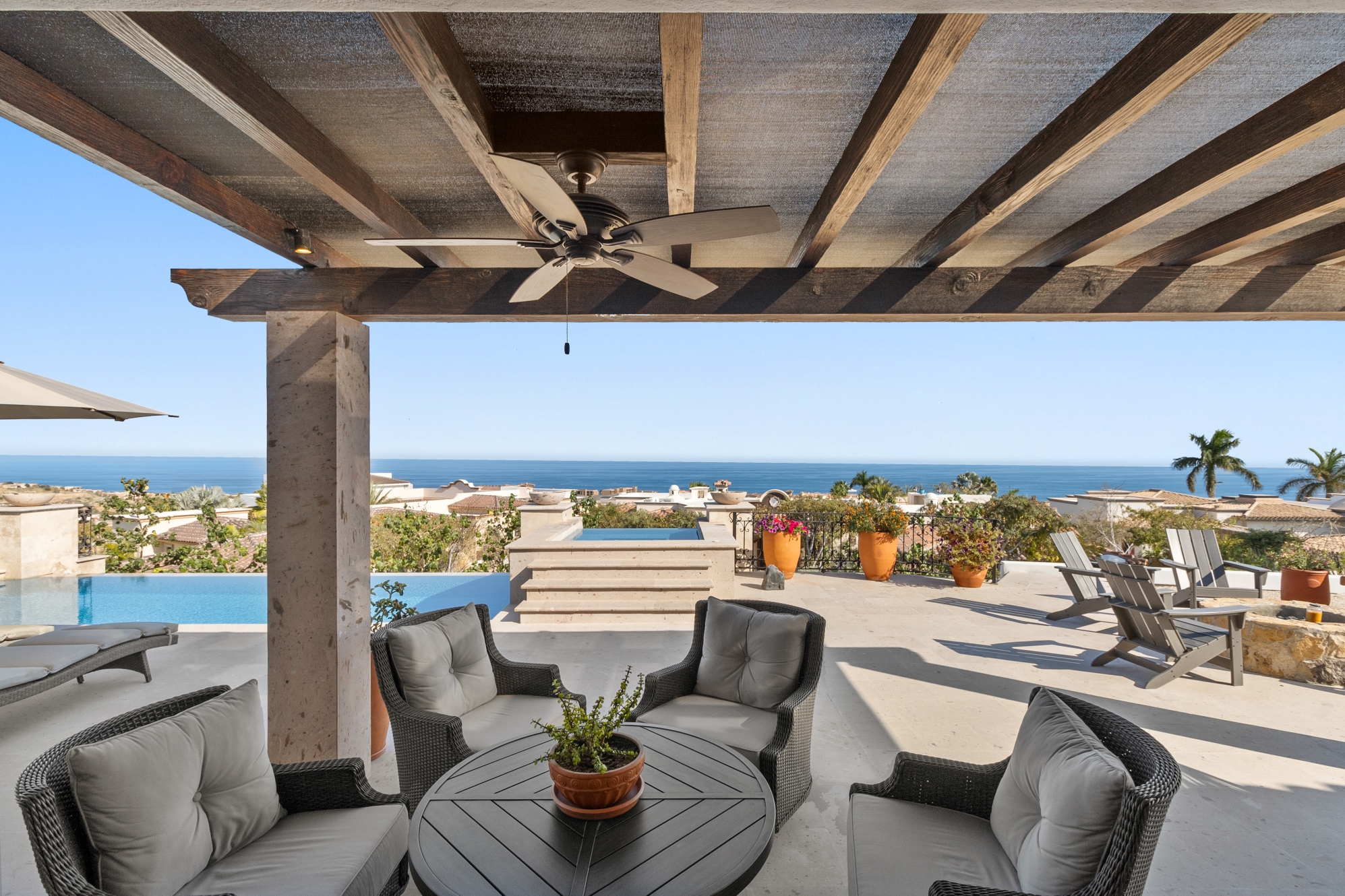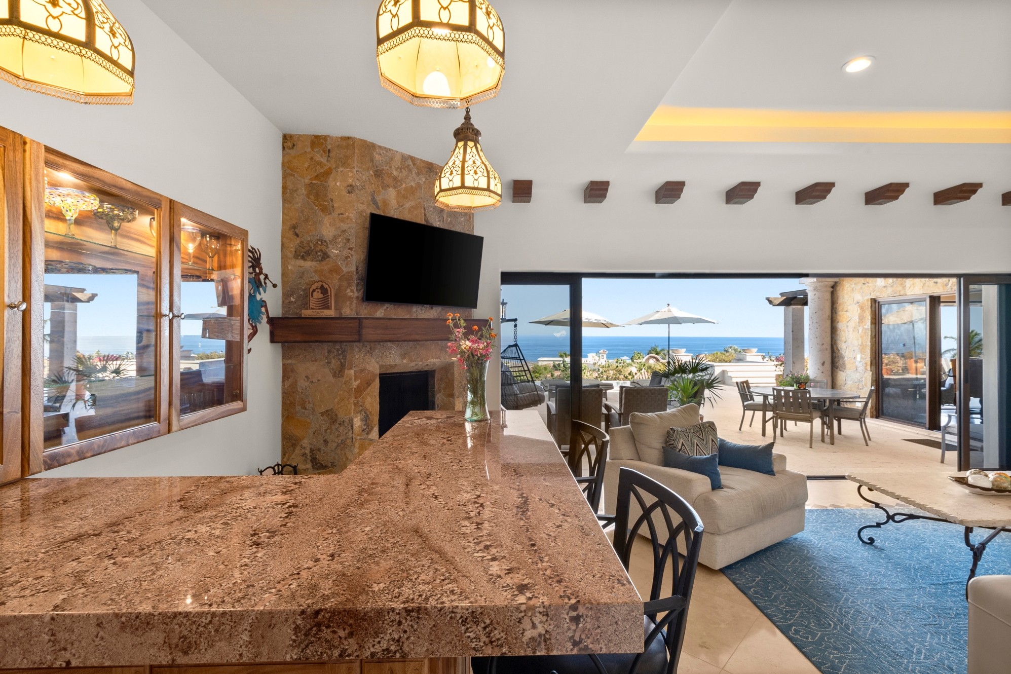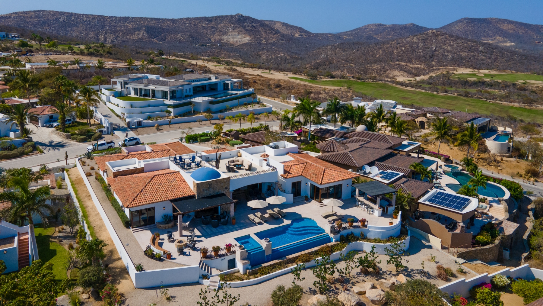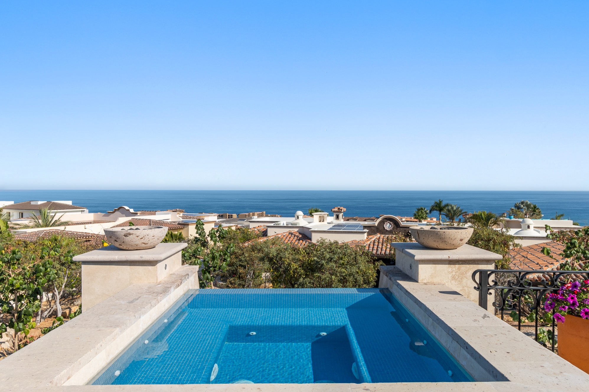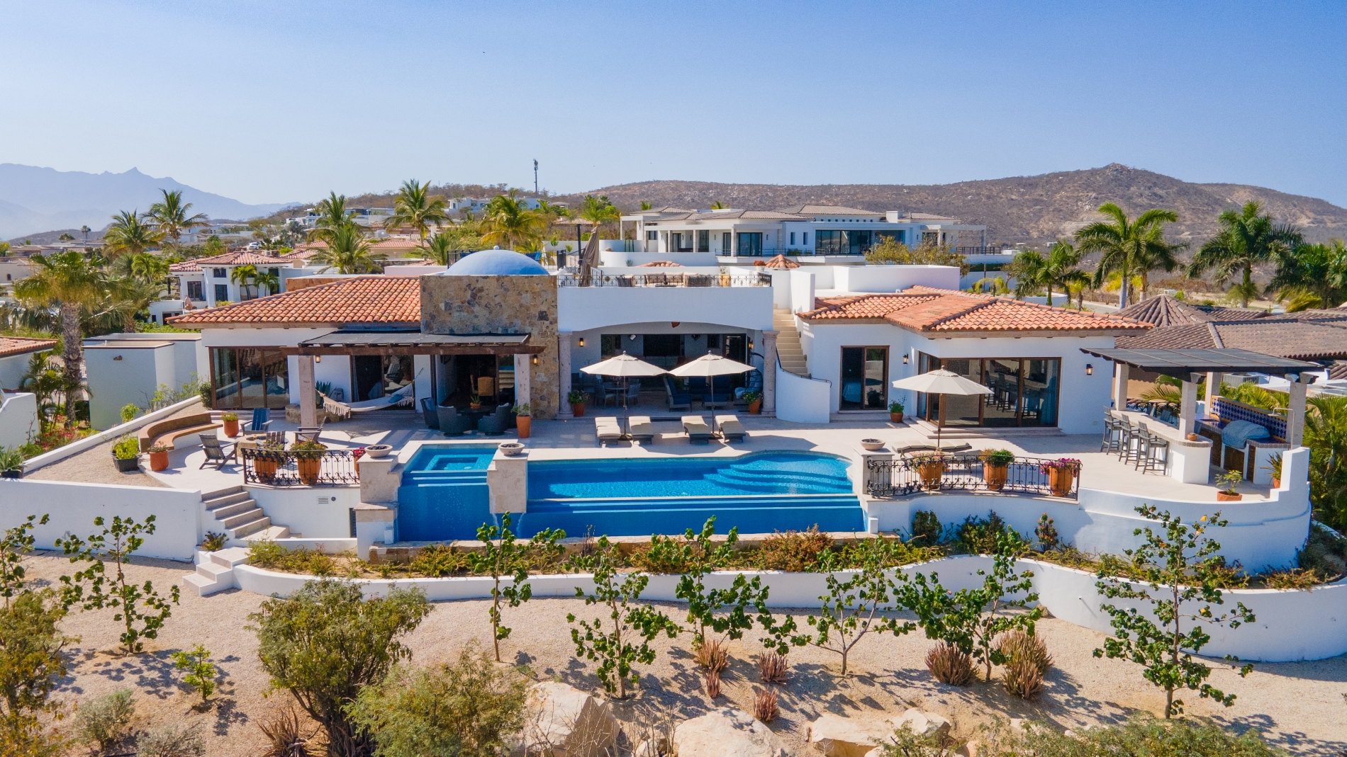 Nestled atop the Altillo Community, this remarkable single-level, seven-bedroom home boasts unbeatable 180-degree views, including Palmilla Point, the lighthouse, the marina, the golf course, mountains, and city lights. The expansive open floor plan includes five spacious bedrooms, each with an en-suite bathroom, perfect for relaxation. Additional features include a TV room, gym, and a charming casita complete with its own private kitchen, living room, and bedroom. The home is designed with two walk-in master closets, eight skylights, an outdoor shower, and a Sonos music system both inside and outside. The hurricane-resistant windows flood the home with natural light, offering breathtaking ocean vistas from every room. The outdoor pool and BBQ area seamlessly blend indoor and outdoor living, creating an ideal space for entertaining. The two-level rooftop sitting area provides a perfect spot to enjoy sunrises, sunsets, and moonrises. At the end of the day, you can relax on the roof deck, enjoying a glass of wine while taking in the unobstructed 360-degree views - a rare feature in PLC. This home truly offers a unique and luxurious living experience.