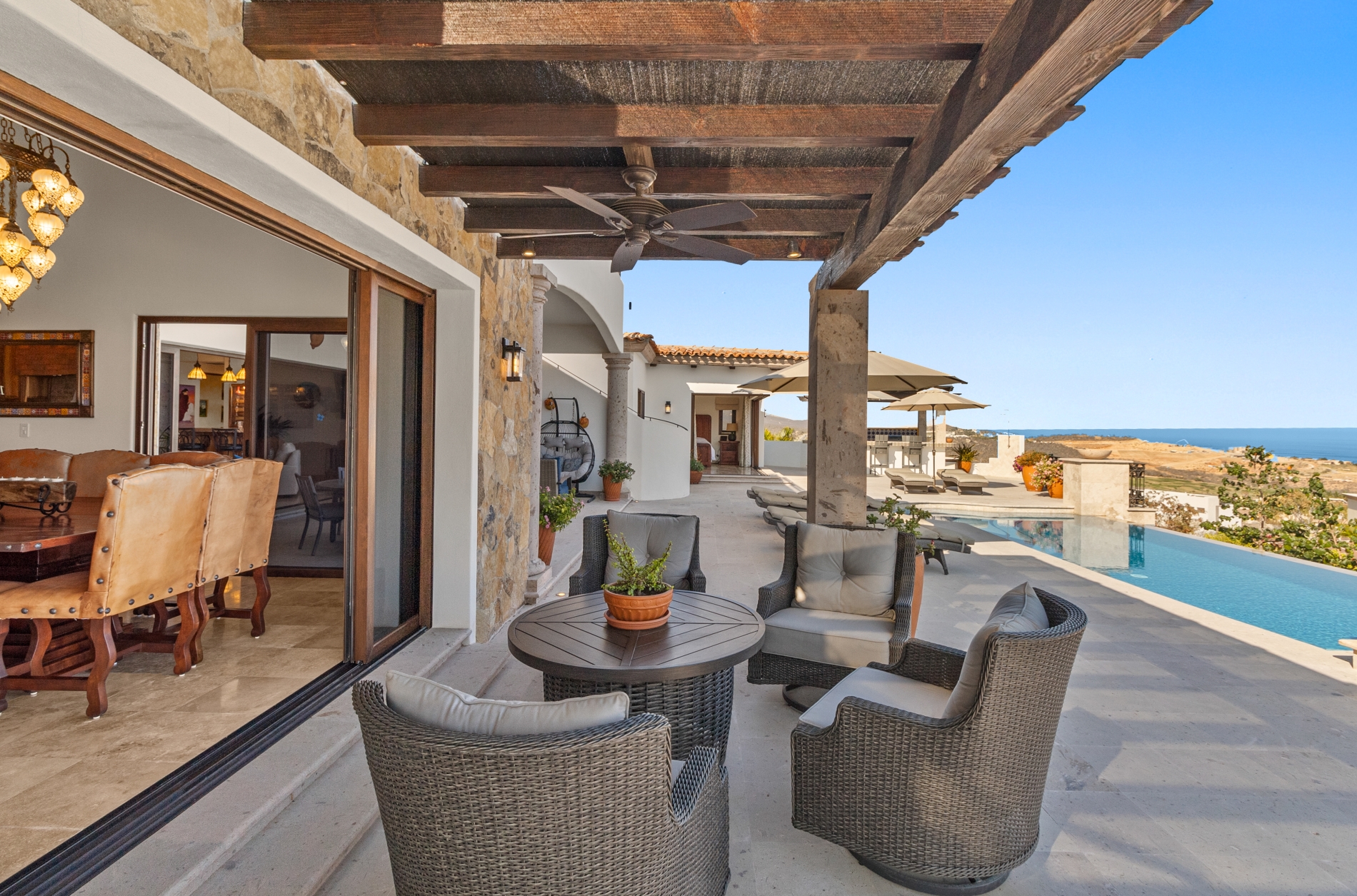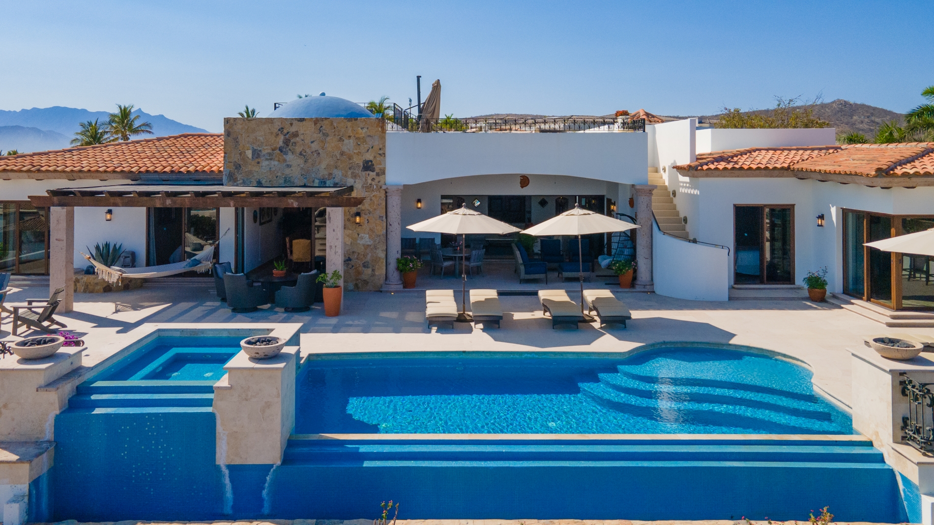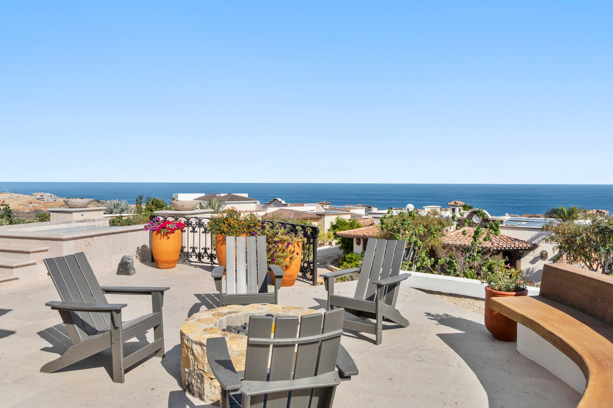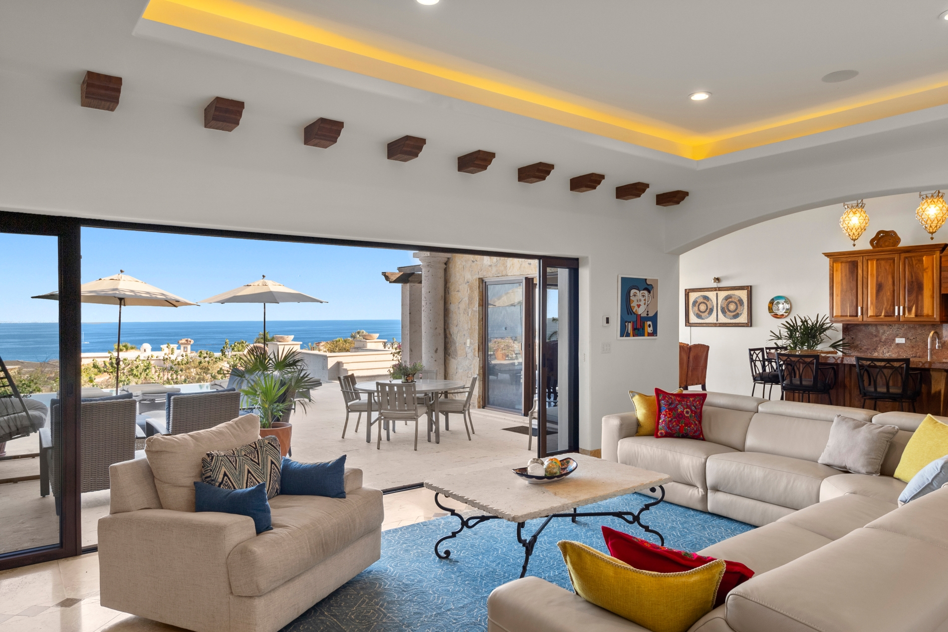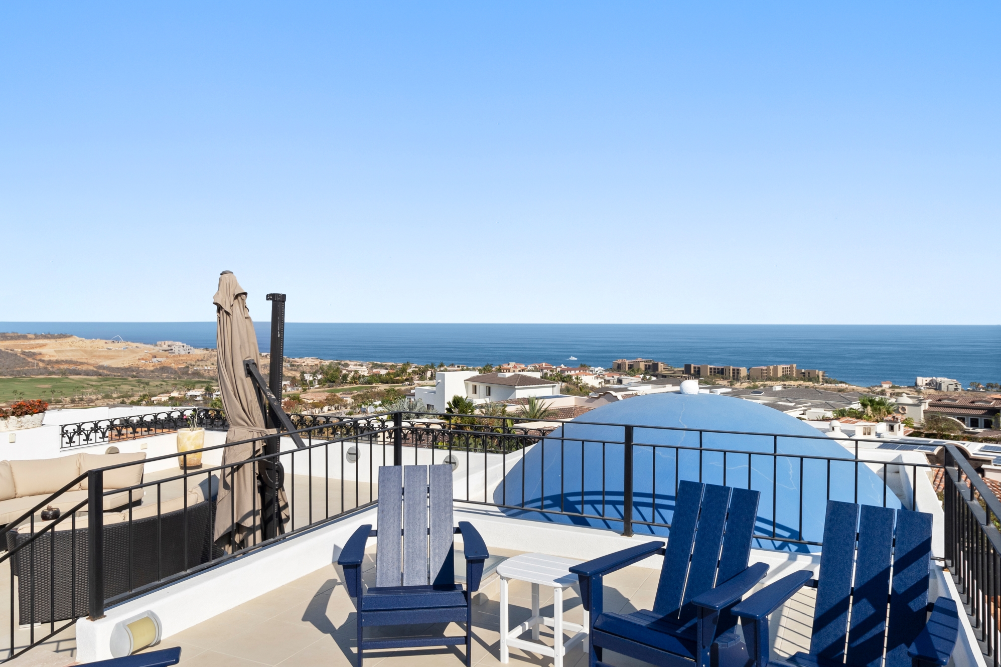 Nestled atop the Altillo Community, this remarkable single-level, seven-bedroom home boasts unbeatable 180-degree views, including Palmilla Point, the lighthouse, the marina, the golf course, mountains, and city lights. The expansive open floor plan includes five spacious bedrooms, each with an en-suite bathroom, perfect for relaxation. Additional features include a TV room, gym, and a charming casita complete with its own private kitchen, living room, and bedroom. The home is designed with two walk-in master closets, eight skylights, an outdoor shower, and a Sonos music system both inside and outside. The hurricane-resistant windows flood the home with natural light, offering breathtaking ocean vistas from every room. The outdoor pool and BBQ area seamlessly blend indoor and outdoor living, creating an ideal space for entertaining. The two-level rooftop sitting area provides a perfect spot to enjoy sunrises, sunsets, and moonrises. At the end of the day, you can relax on the roof deck, enjoying a glass of wine while taking in the unobstructed 360-degree views - a rare feature in PLC. This home truly offers a unique and luxurious living experience.