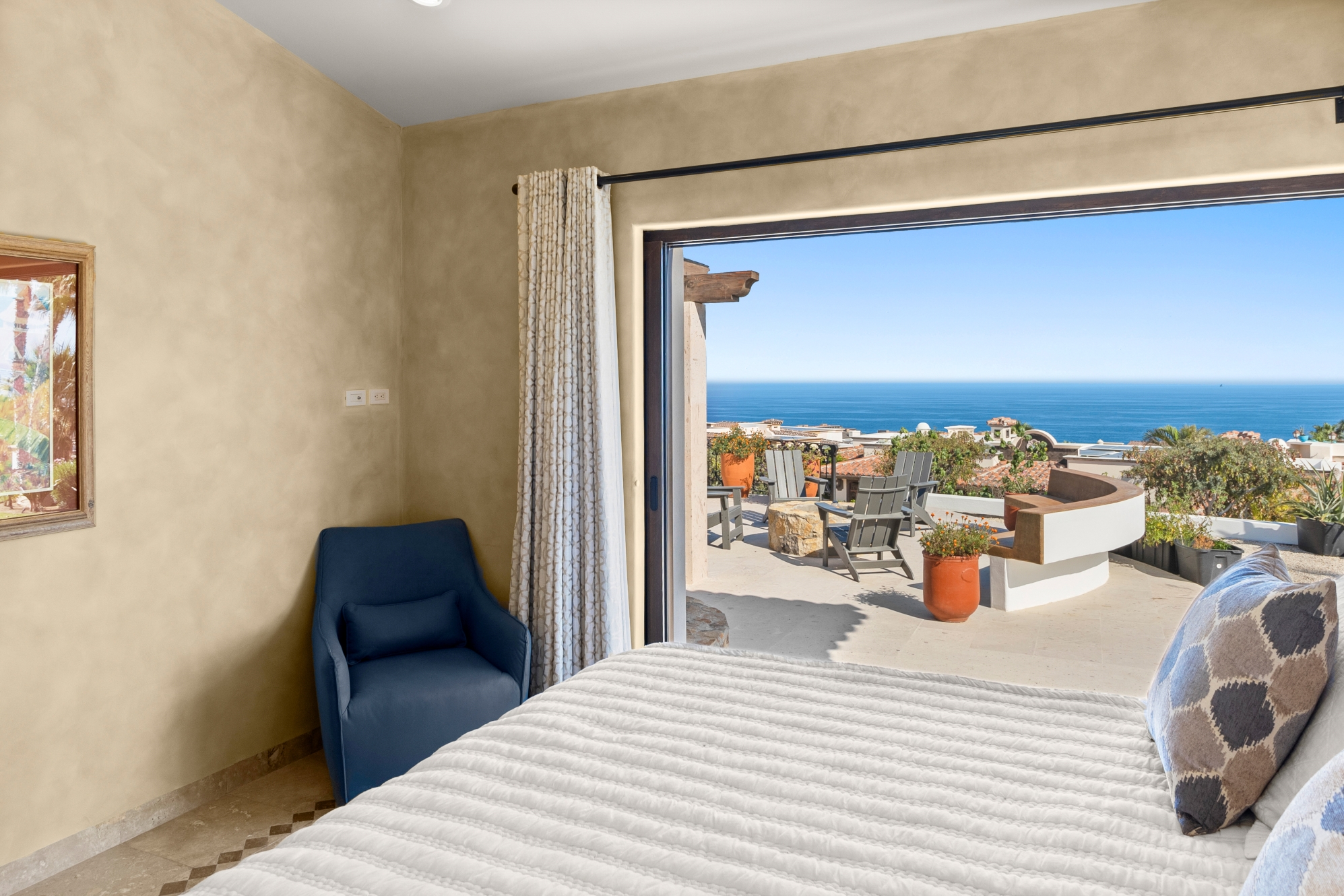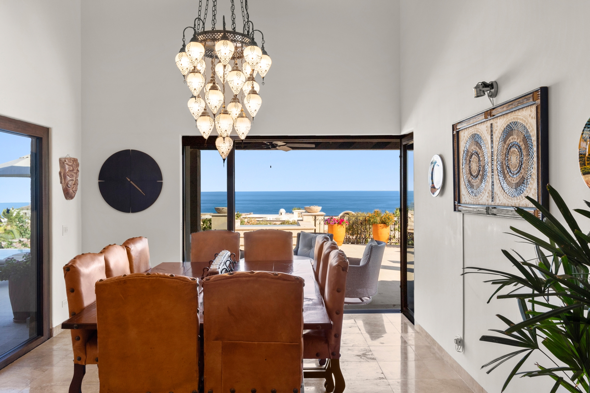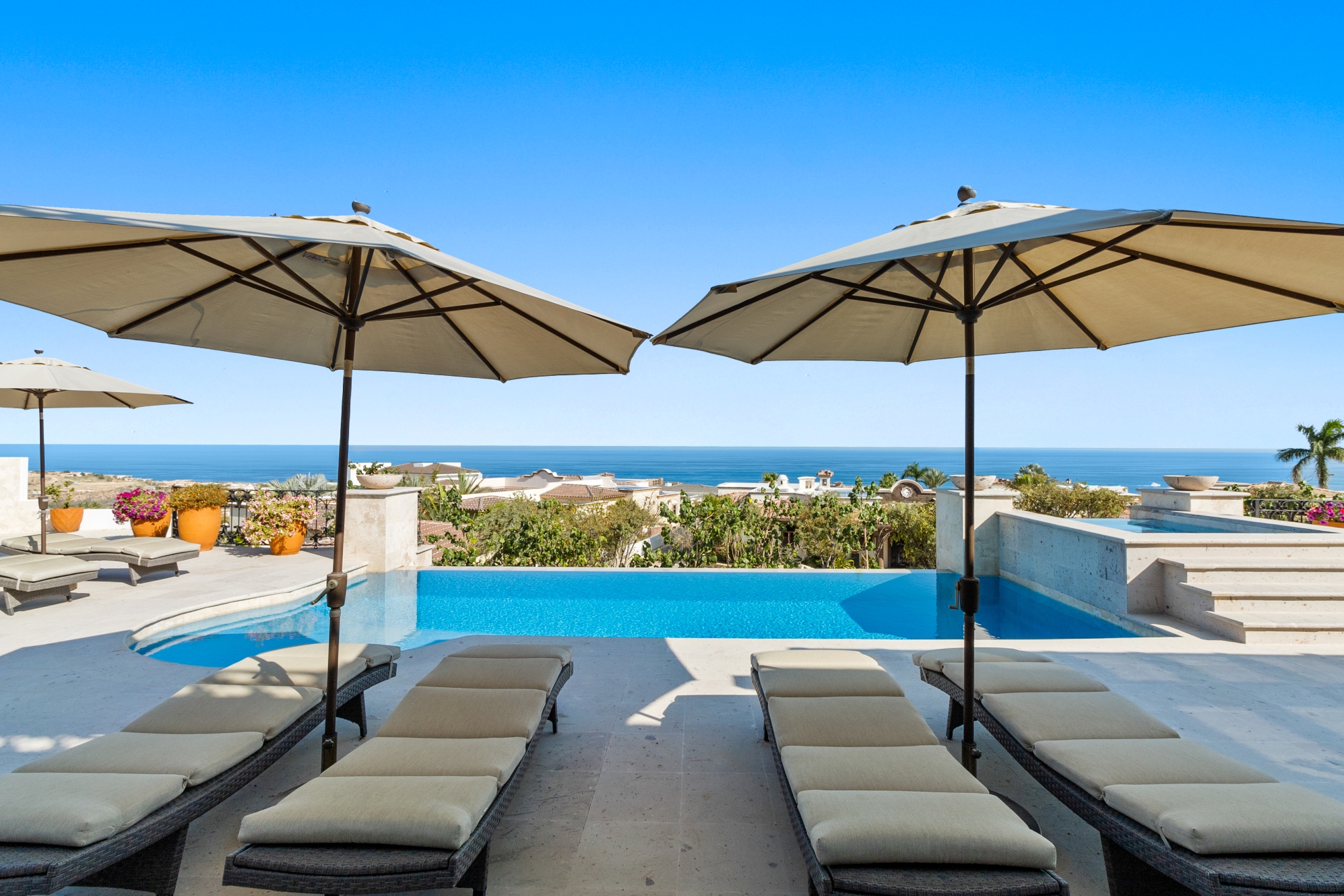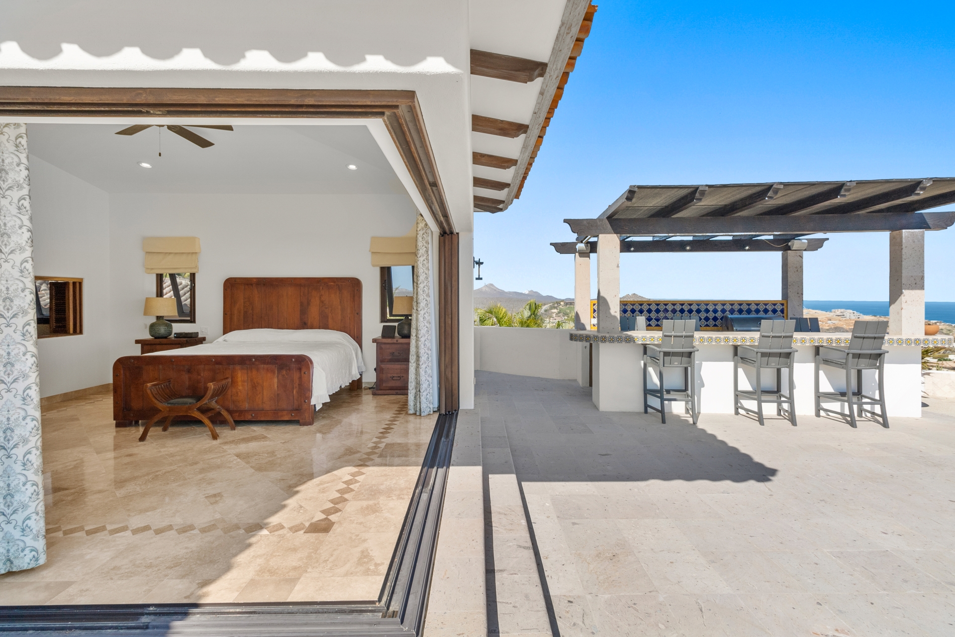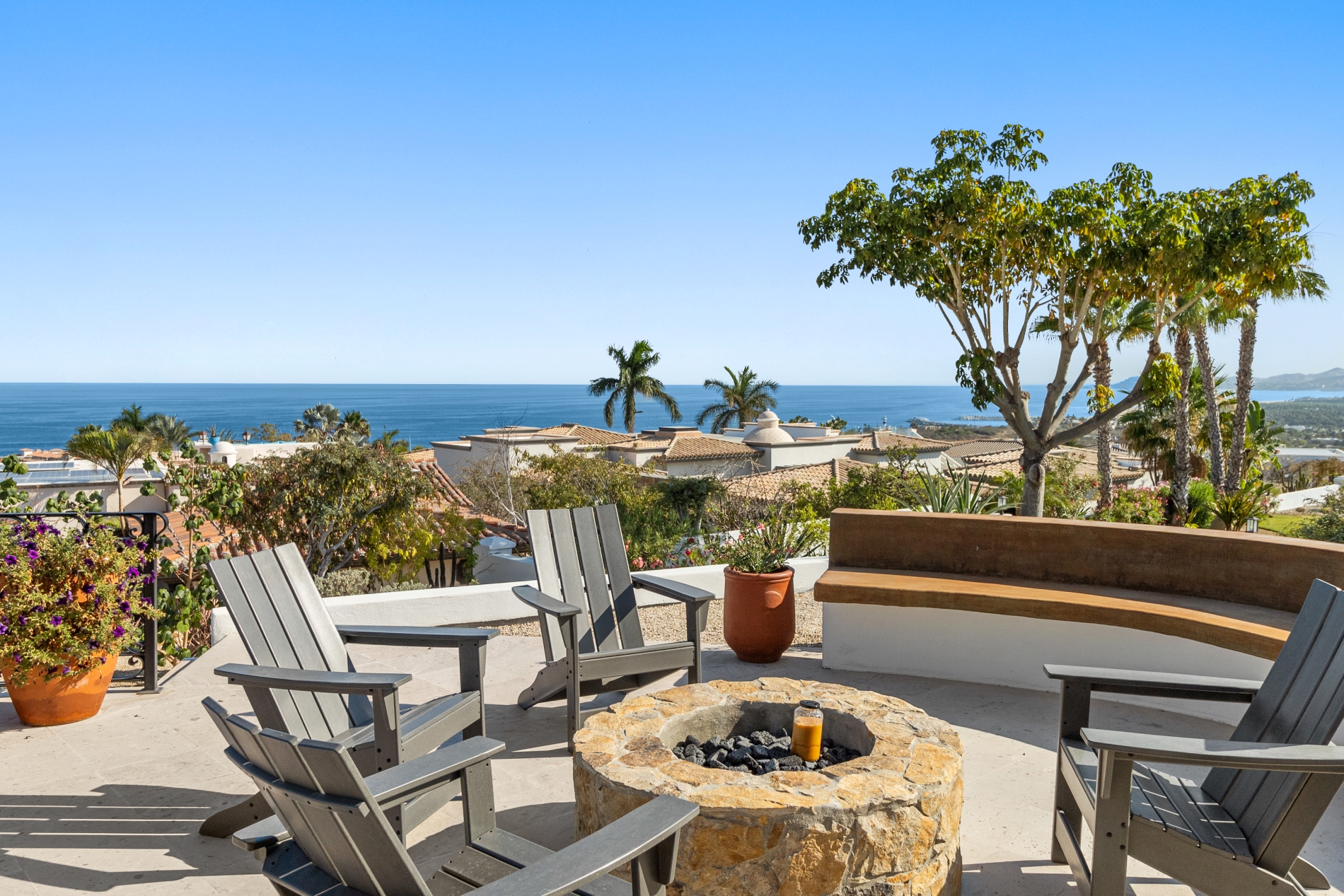 Nestled atop the Altillo Community, this remarkable single-level, seven-bedroom home boasts unbeatable 180-degree views, including Palmilla Point, the lighthouse, the marina, the golf course, mountains, and city lights. The expansive open floor plan includes five spacious bedrooms, each with an en-suite bathroom, perfect for relaxation. Additional features include a TV room, gym, and a charming casita complete with its own private kitchen, living room, and bedroom. The home is designed with two walk-in master closets, eight skylights, an outdoor shower, and a Sonos music system both inside and outside. The hurricane-resistant windows flood the home with natural light, offering breathtaking ocean vistas from every room. The outdoor pool and BBQ area seamlessly blend indoor and outdoor living, creating an ideal space for entertaining. The two-level rooftop sitting area provides a perfect spot to enjoy sunrises, sunsets, and moonrises. At the end of the day, you can relax on the roof deck, enjoying a glass of wine while taking in the unobstructed 360-degree views - a rare feature in PLC. This home truly offers a unique and luxurious living experience.