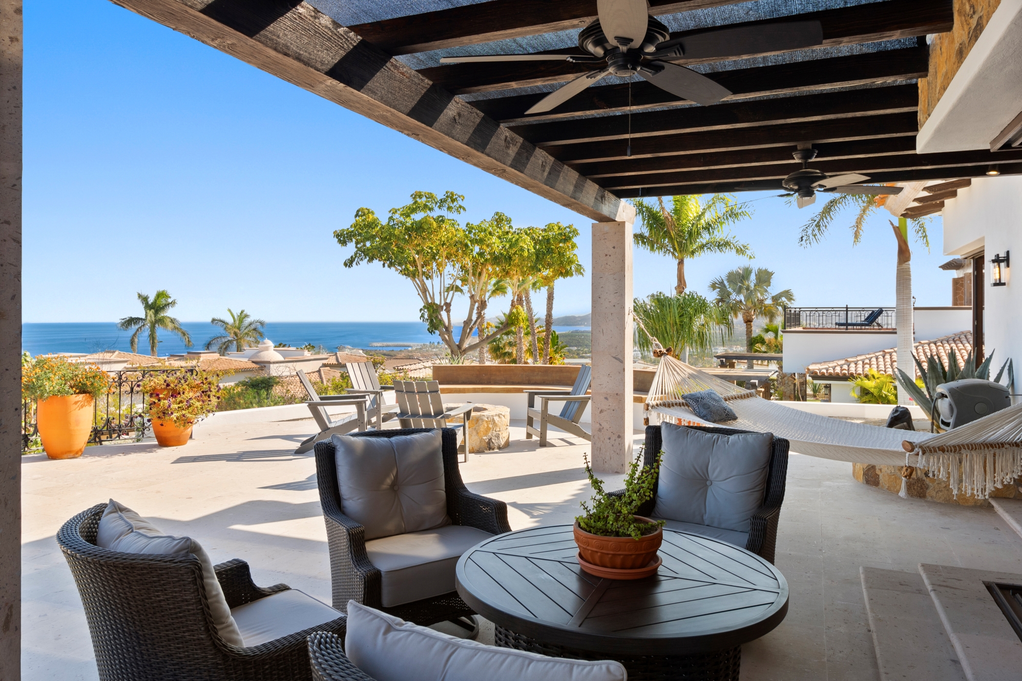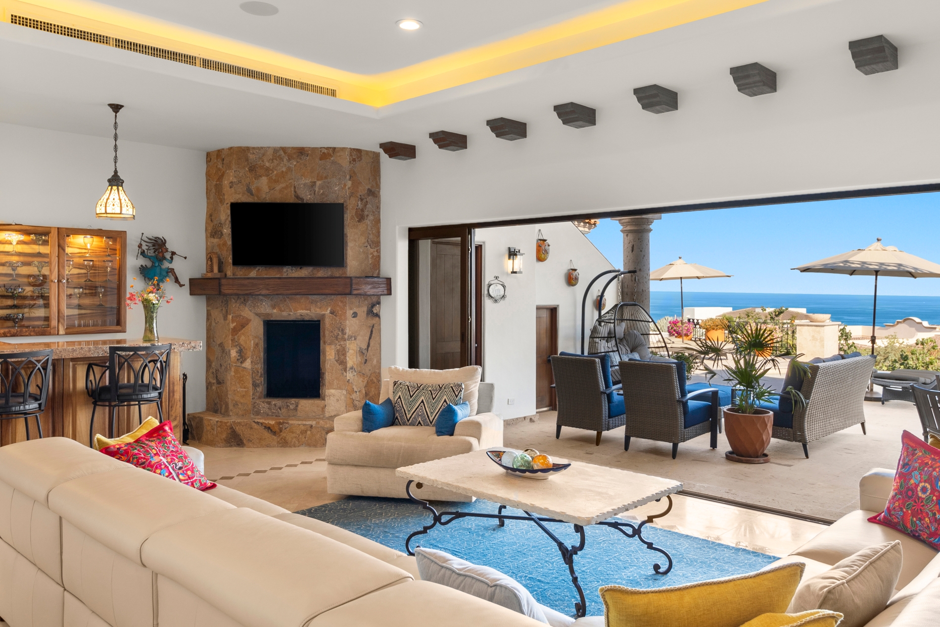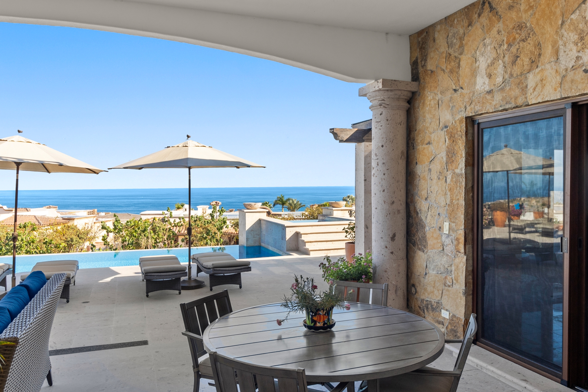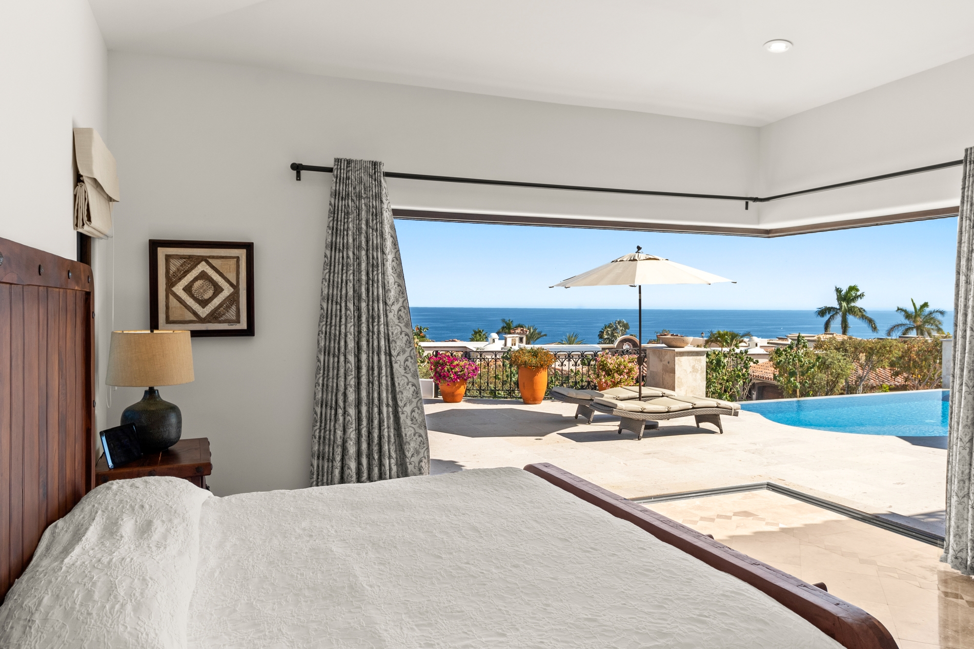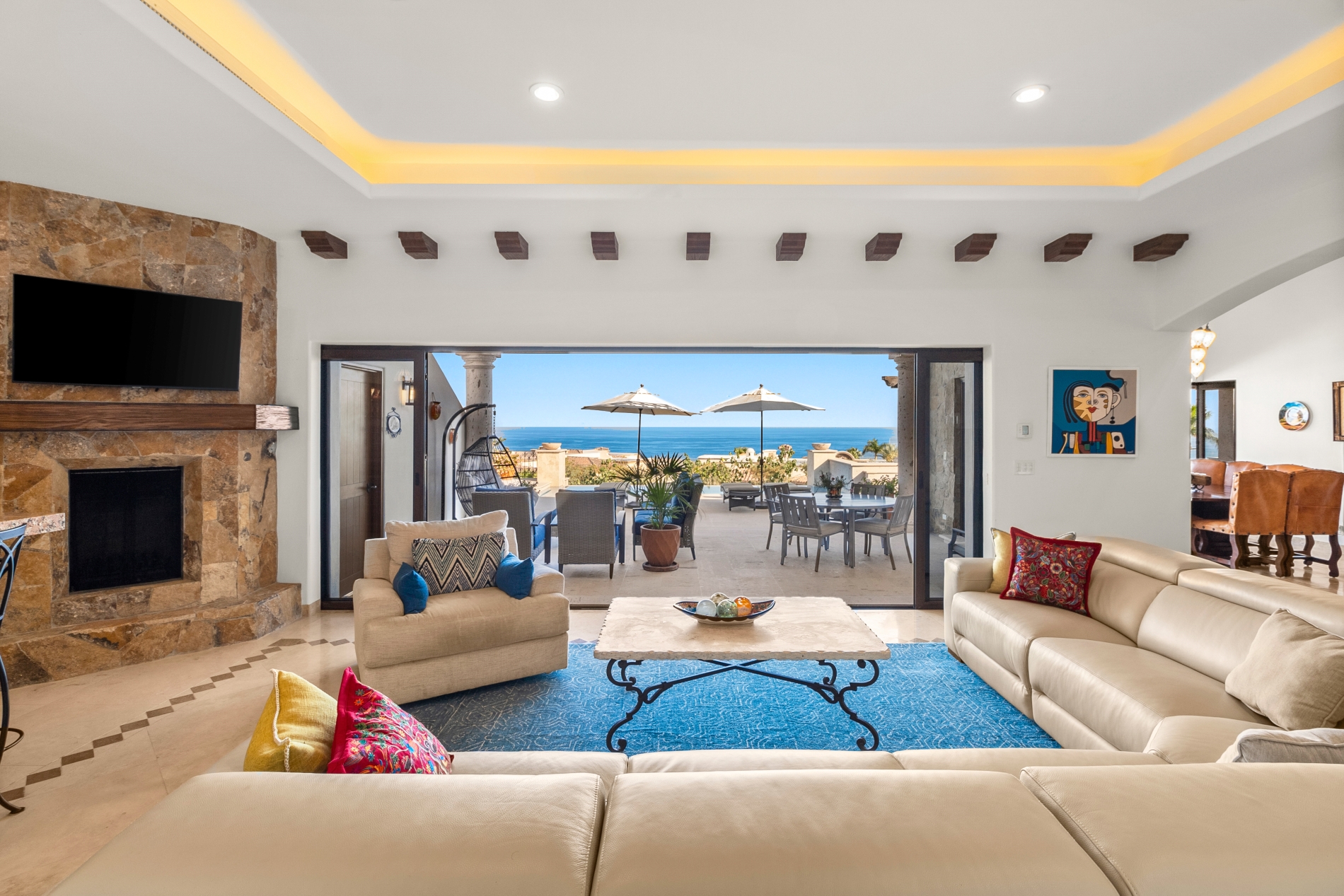 Nestled atop the Altillo Community, this remarkable single-level, seven-bedroom home boasts unbeatable 180-degree views, including Palmilla Point, the lighthouse, the marina, the golf course, mountains, and city lights. The expansive open floor plan includes five spacious bedrooms, each with an en-suite bathroom, perfect for relaxation. Additional features include a TV room, gym, and a charming casita complete with its own private kitchen, living room, and bedroom. The home is designed with two walk-in master closets, eight skylights, an outdoor shower, and a Sonos music system both inside and outside. The hurricane-resistant windows flood the home with natural light, offering breathtaking ocean vistas from every room. The outdoor pool and BBQ area seamlessly blend indoor and outdoor living, creating an ideal space for entertaining. The two-level rooftop sitting area provides a perfect spot to enjoy sunrises, sunsets, and moonrises. At the end of the day, you can relax on the roof deck, enjoying a glass of wine while taking in the unobstructed 360-degree views - a rare feature in PLC. This home truly offers a unique and luxurious living experience.