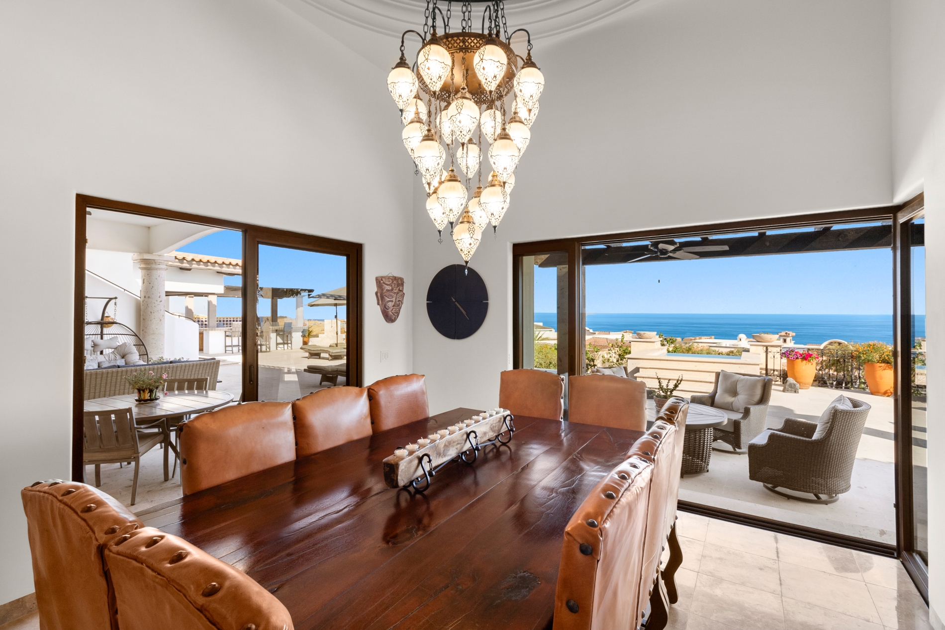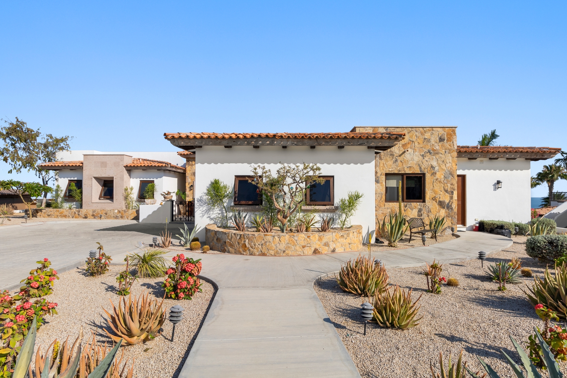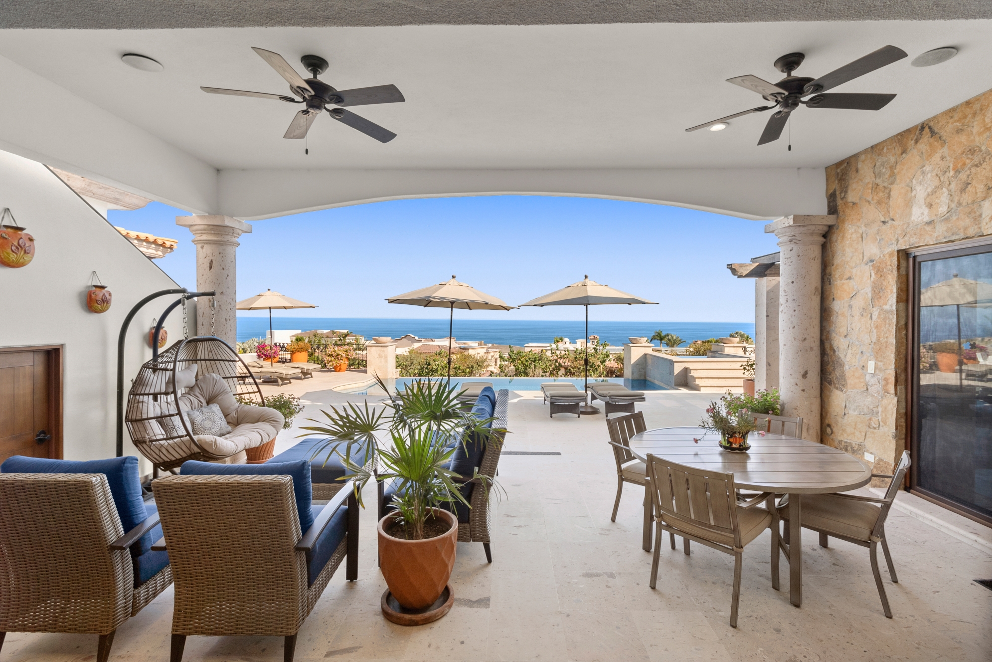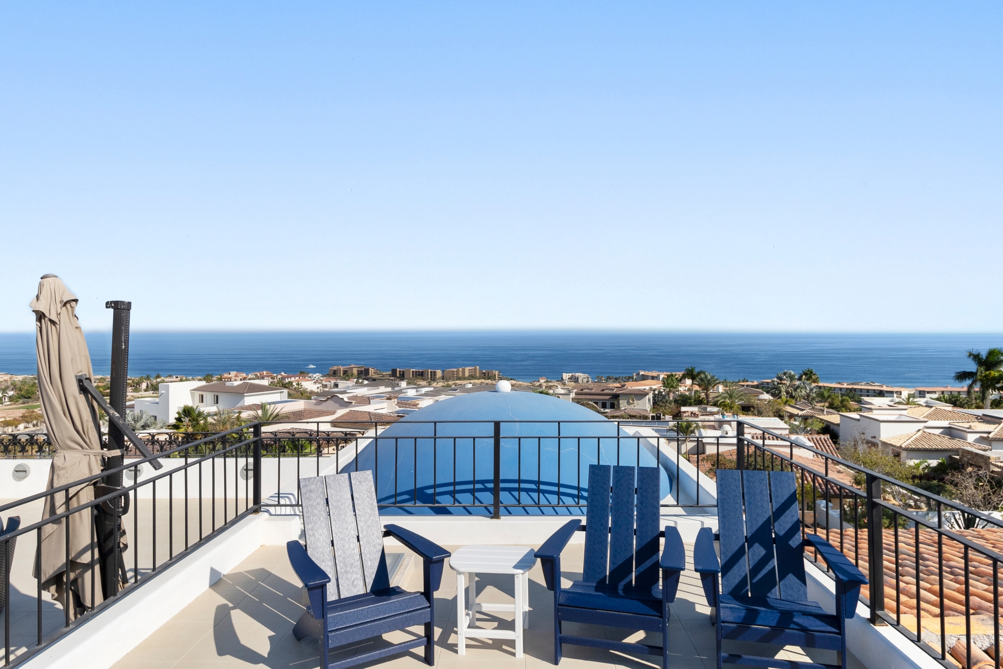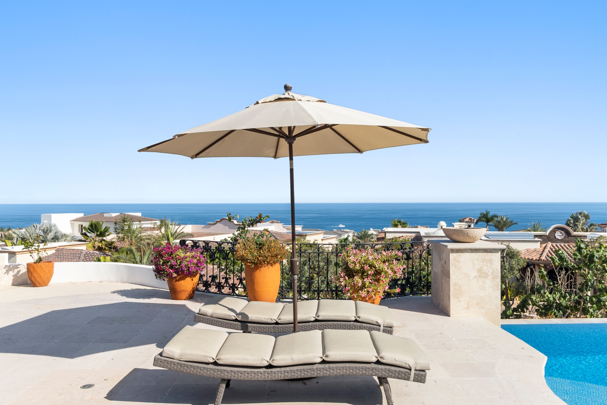 Nestled atop the Altillo Community, this remarkable single-level, seven-bedroom home boasts unbeatable 180-degree views, including Palmilla Point, the lighthouse, the marina, the golf course, mountains, and city lights. The expansive open floor plan includes five spacious bedrooms, each with an en-suite bathroom, perfect for relaxation. Additional features include a TV room, gym, and a charming casita complete with its own private kitchen, living room, and bedroom. The home is designed with two walk-in master closets, eight skylights, an outdoor shower, and a Sonos music system both inside and outside. The hurricane-resistant windows flood the home with natural light, offering breathtaking ocean vistas from every room. The outdoor pool and BBQ area seamlessly blend indoor and outdoor living, creating an ideal space for entertaining. The two-level rooftop sitting area provides a perfect spot to enjoy sunrises, sunsets, and moonrises. At the end of the day, you can relax on the roof deck, enjoying a glass of wine while taking in the unobstructed 360-degree views - a rare feature in PLC. This home truly offers a unique and luxurious living experience.