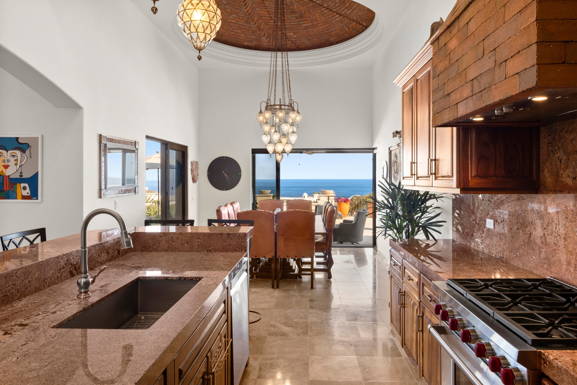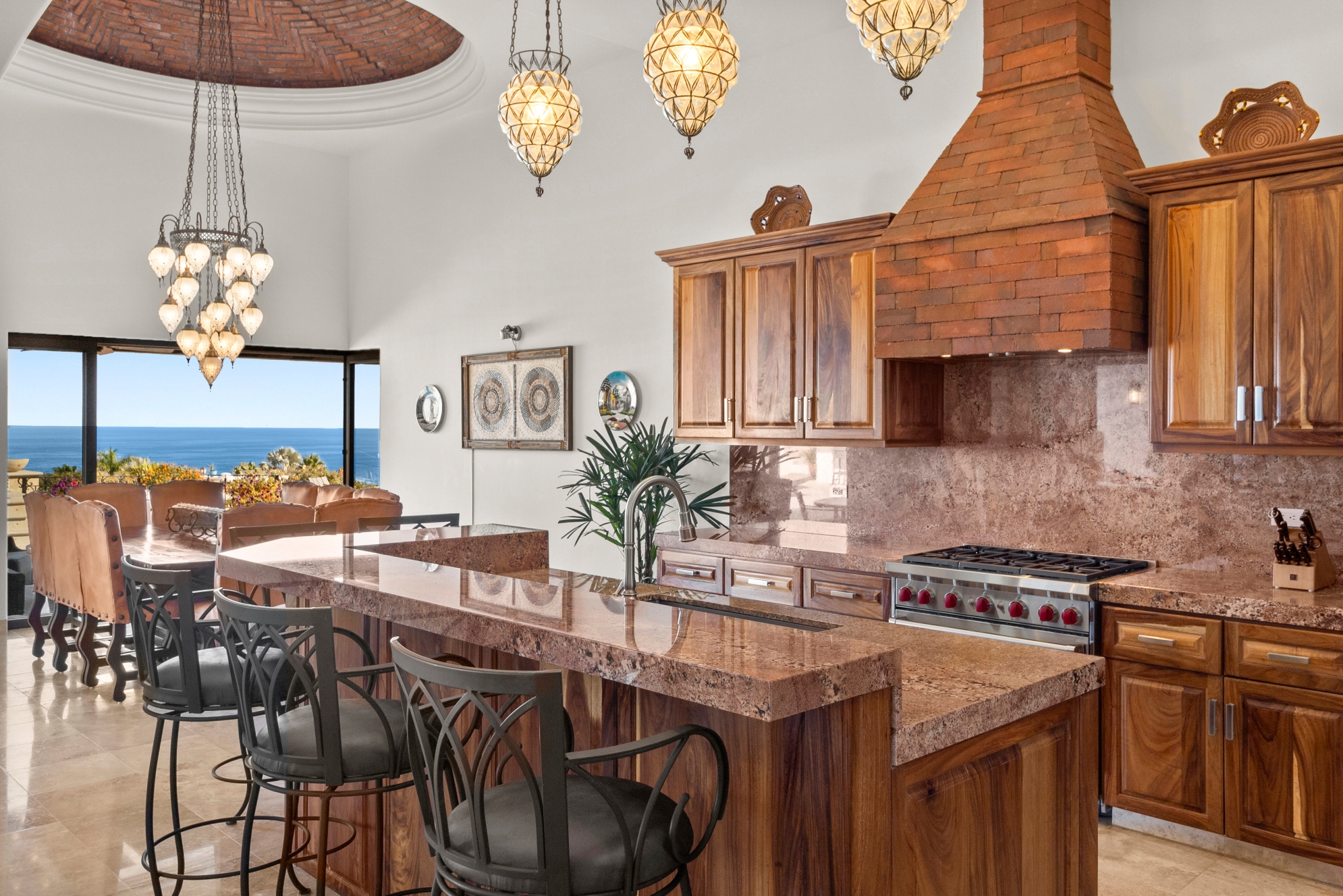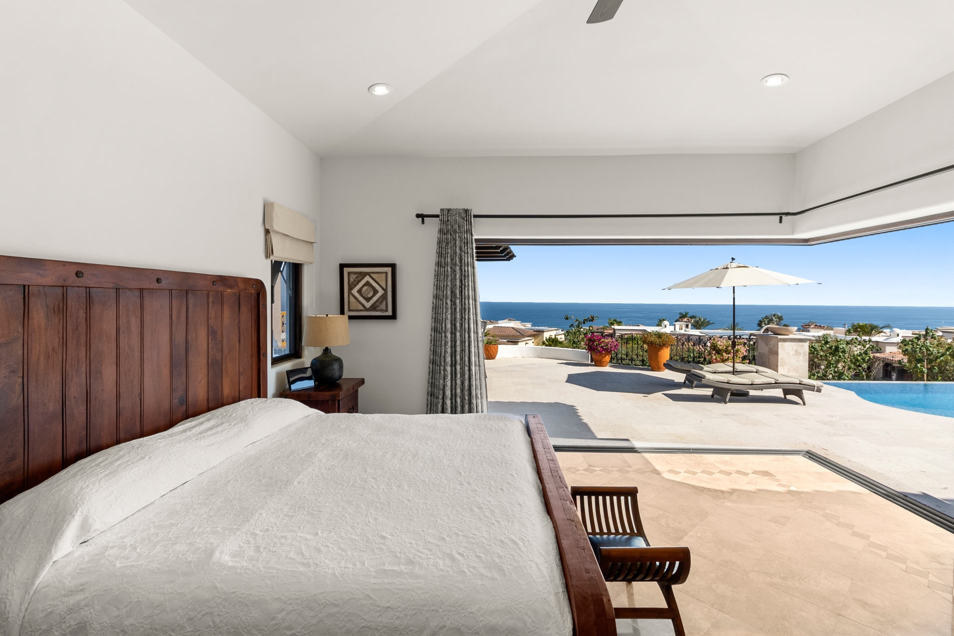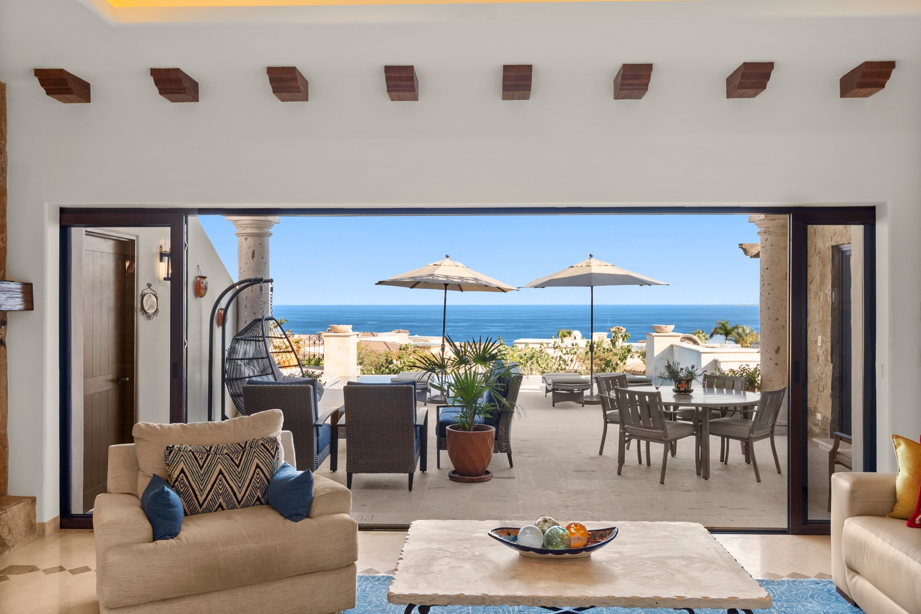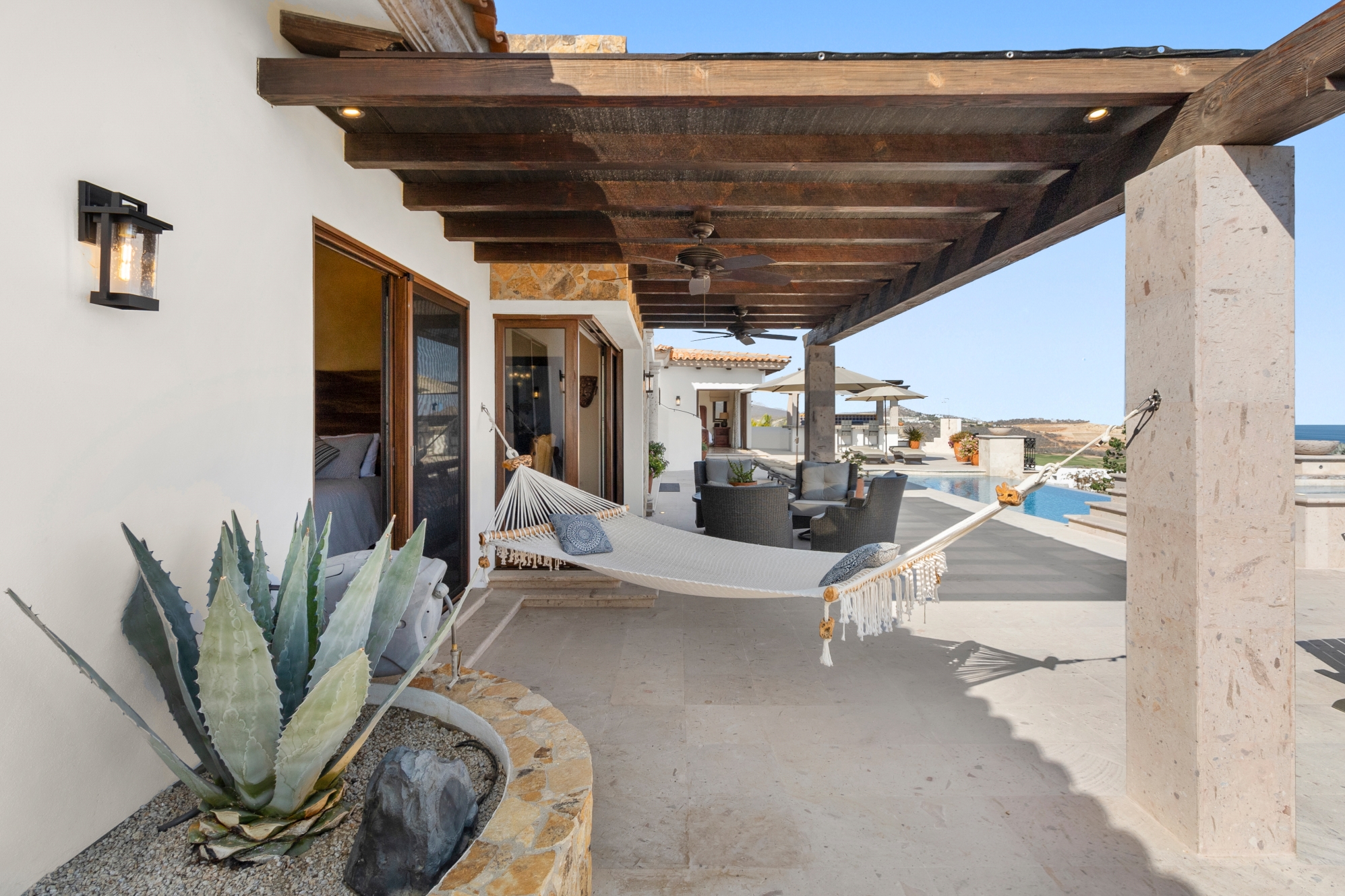 Nestled atop the Altillo Community, this remarkable single-level, seven-bedroom home boasts unbeatable 180-degree views, including Palmilla Point, the lighthouse, the marina, the golf course, mountains, and city lights. The expansive open floor plan includes five spacious bedrooms, each with an en-suite bathroom, perfect for relaxation. Additional features include a TV room, gym, and a charming casita complete with its own private kitchen, living room, and bedroom. The home is designed with two walk-in master closets, eight skylights, an outdoor shower, and a Sonos music system both inside and outside. The hurricane-resistant windows flood the home with natural light, offering breathtaking ocean vistas from every room. The outdoor pool and BBQ area seamlessly blend indoor and outdoor living, creating an ideal space for entertaining. The two-level rooftop sitting area provides a perfect spot to enjoy sunrises, sunsets, and moonrises. At the end of the day, you can relax on the roof deck, enjoying a glass of wine while taking in the unobstructed 360-degree views - a rare feature in PLC. This home truly offers a unique and luxurious living experience.