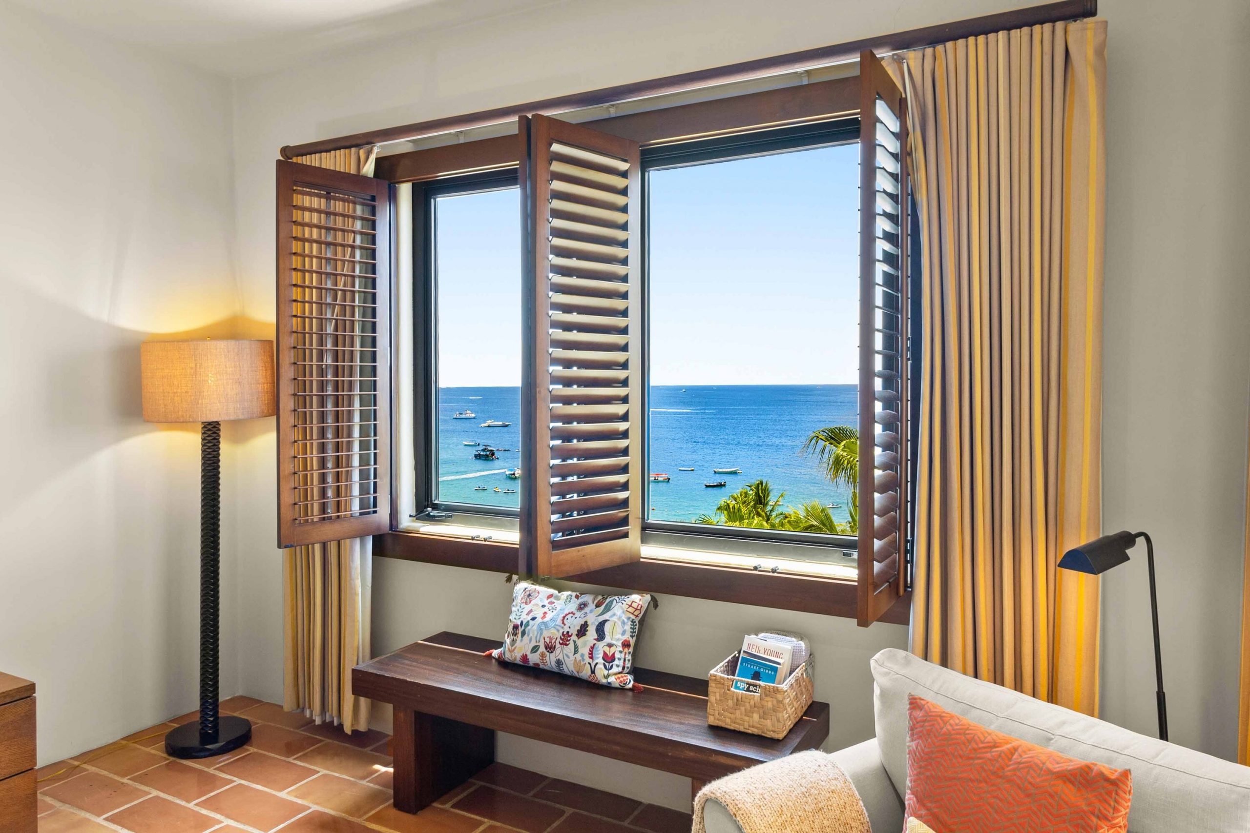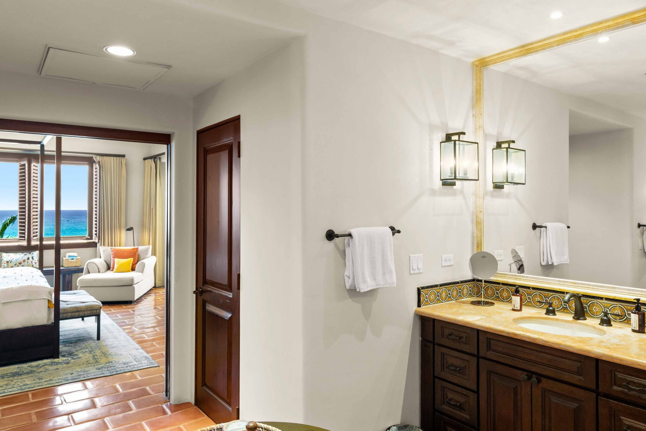 The guest suite also enjoys sea views and terrace access, with its own private ensuite bathroom. An expanded area offers flexibility for an additional vanity or a comfortable sitting space, ensuring every guest experiences comfort and privacy.