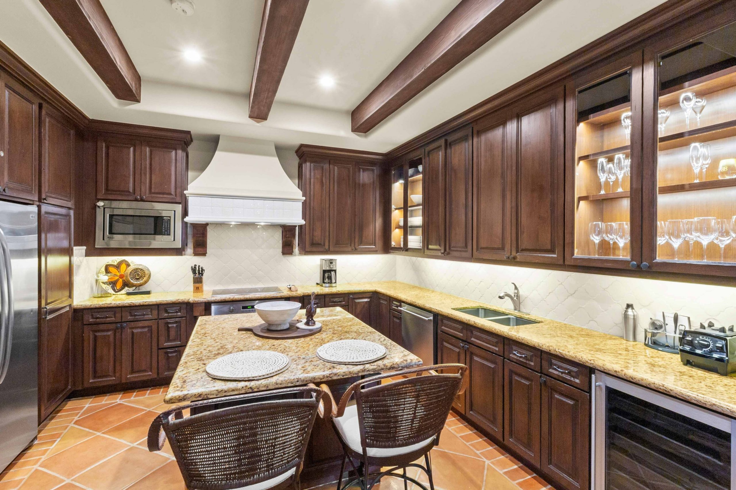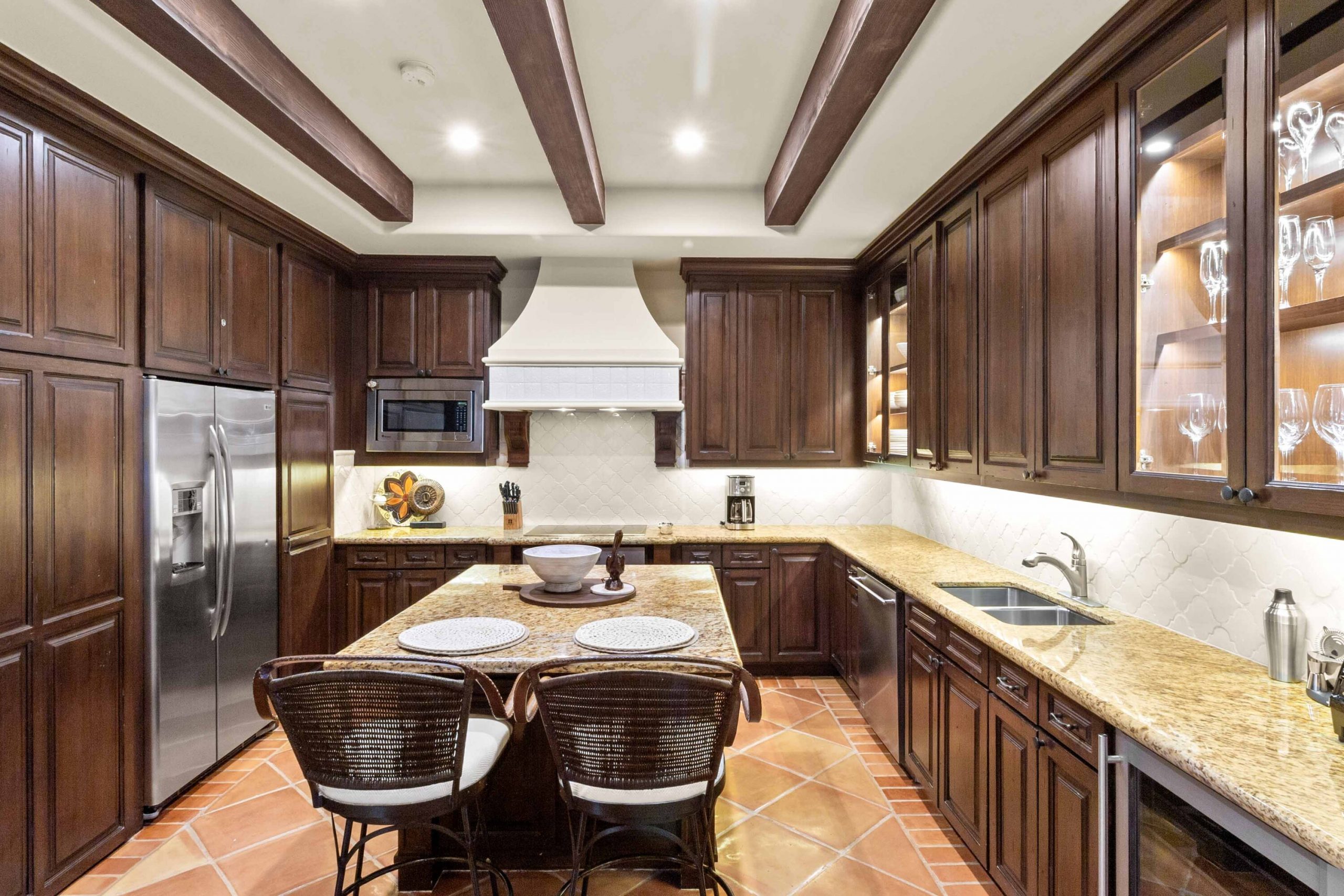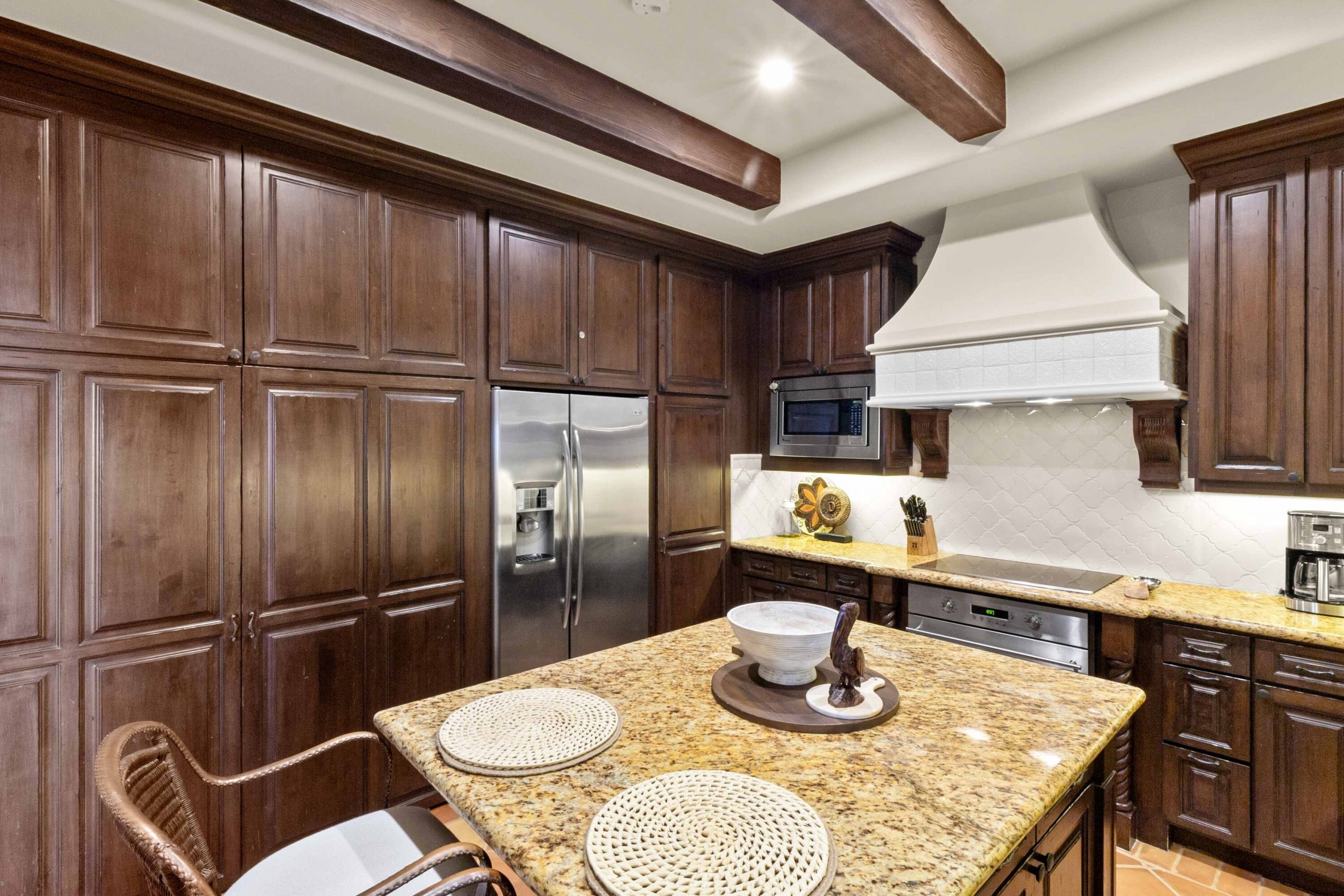Inside, architectural beams and thoughtful design reflect a timeless hacienda-inspired ambiance, adding character and warmth. The kitchen stands at the heart of the homeboth functional and refinedwith high-end appliances, custom cabinetry with integrated lighting, a beautifully remodeled backsplash, a breakfast island, and a discreetly integrated laundry area for convenience without compromise.