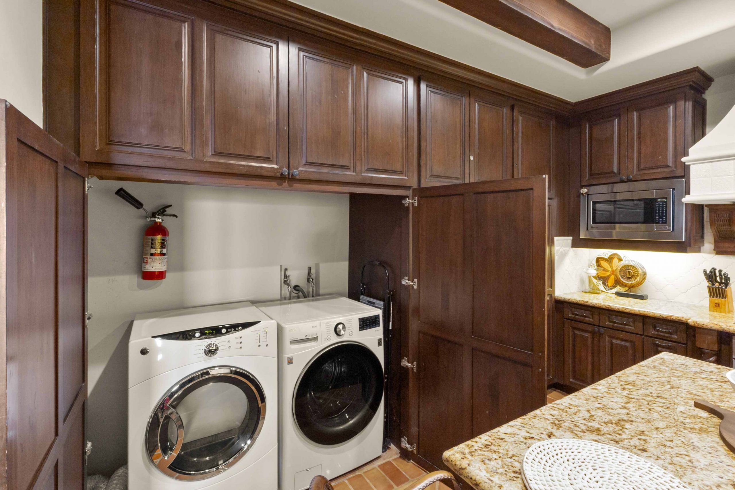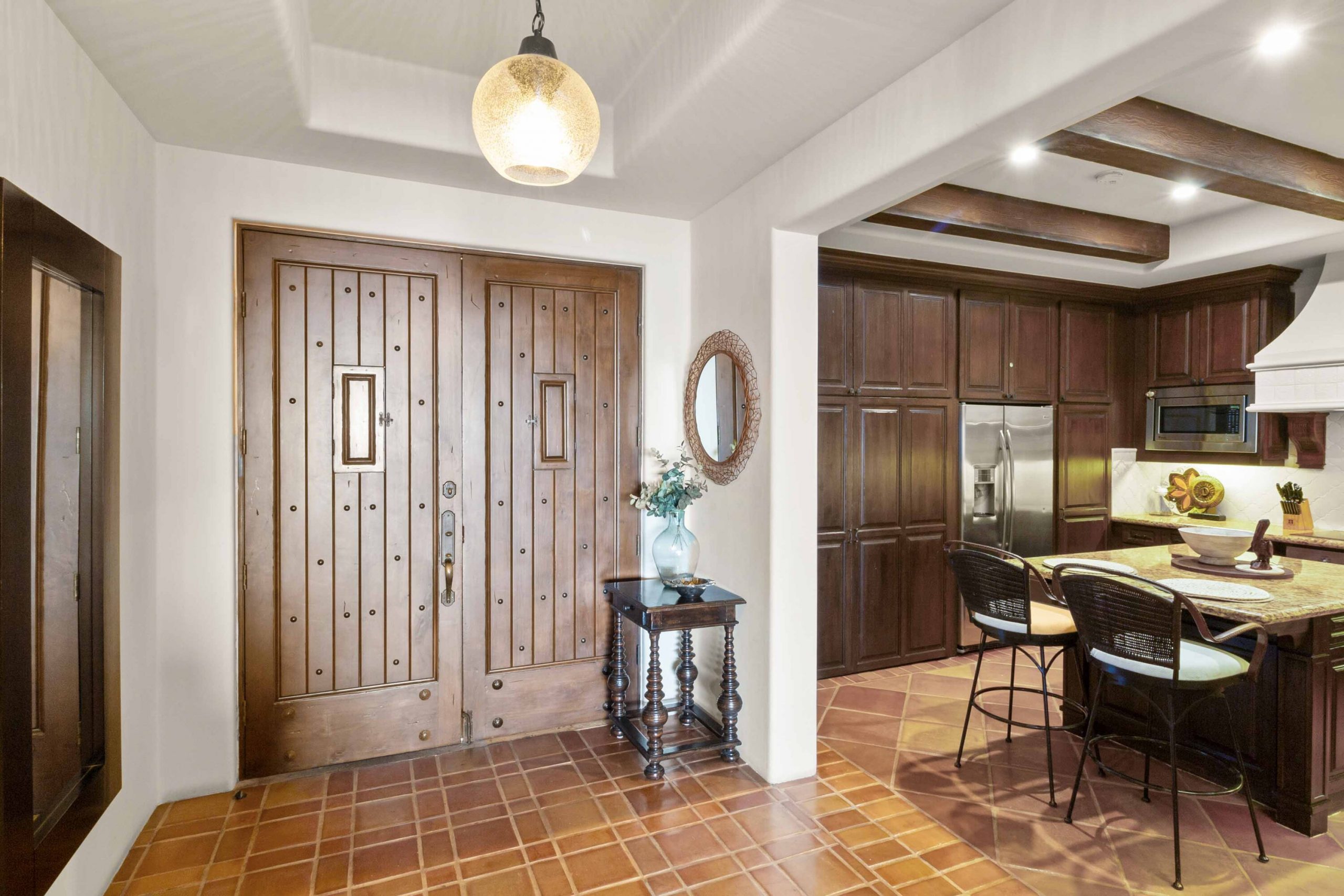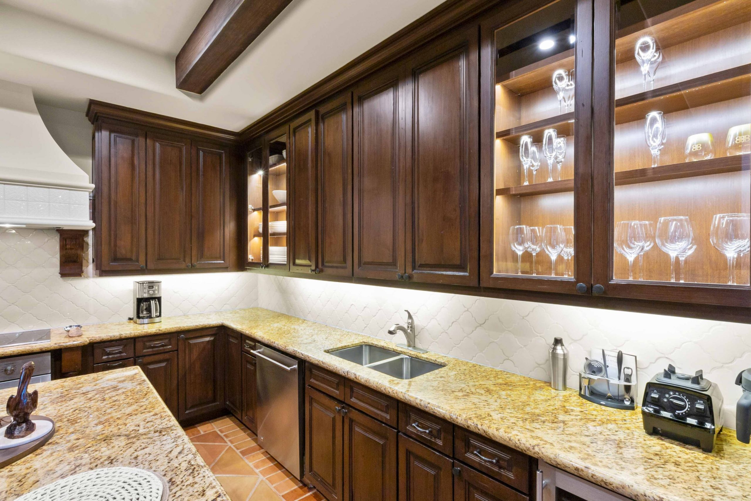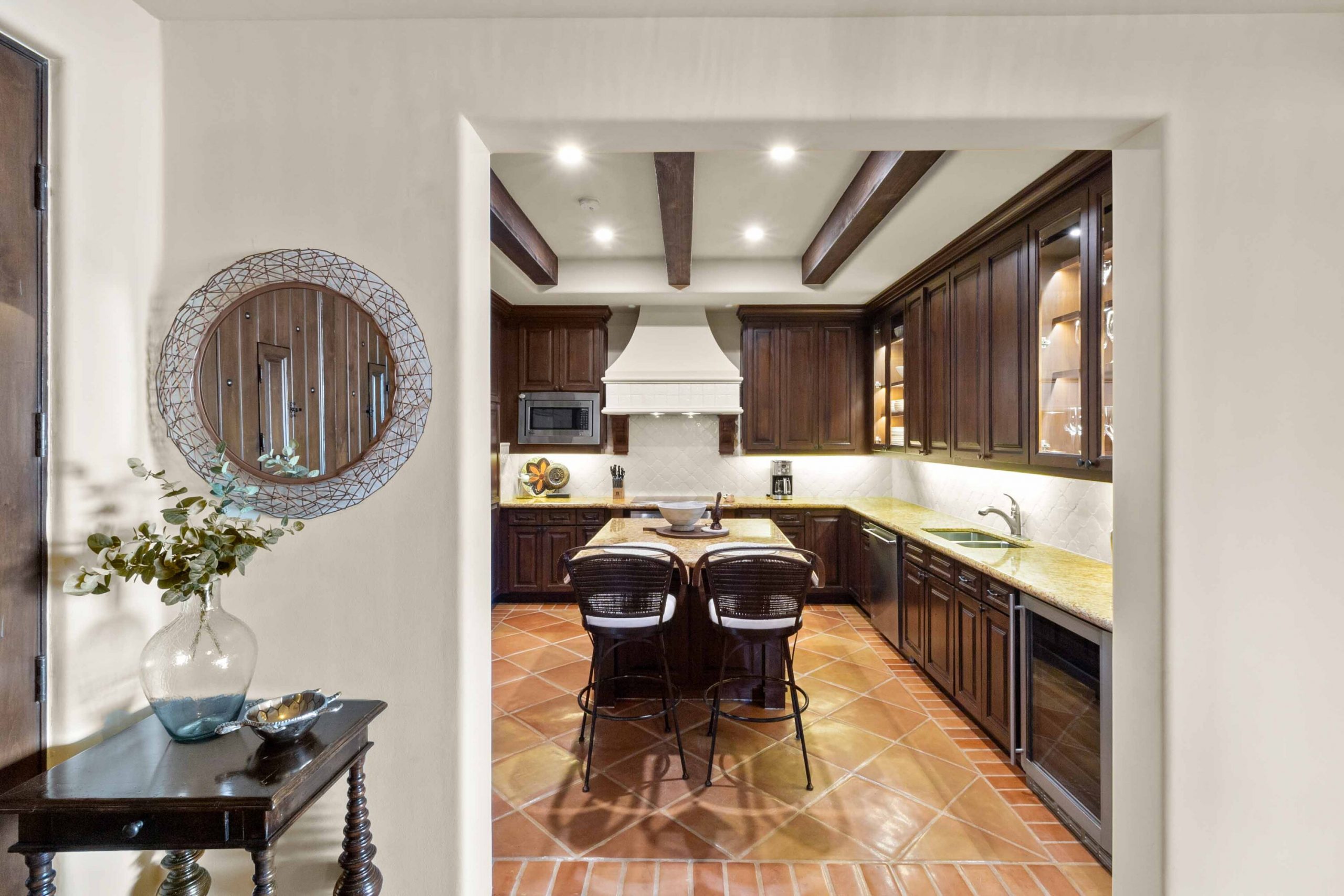 Inside, architectural beams and thoughtful design reflect a timeless hacienda-inspired ambiance, adding character and warmth. The kitchen stands at the heart of the homeboth functional and refinedwith high-end appliances, custom cabinetry with integrated lighting, a beautifully remodeled backsplash, a breakfast island, and a discreetly integrated laundry area for convenience without compromise.